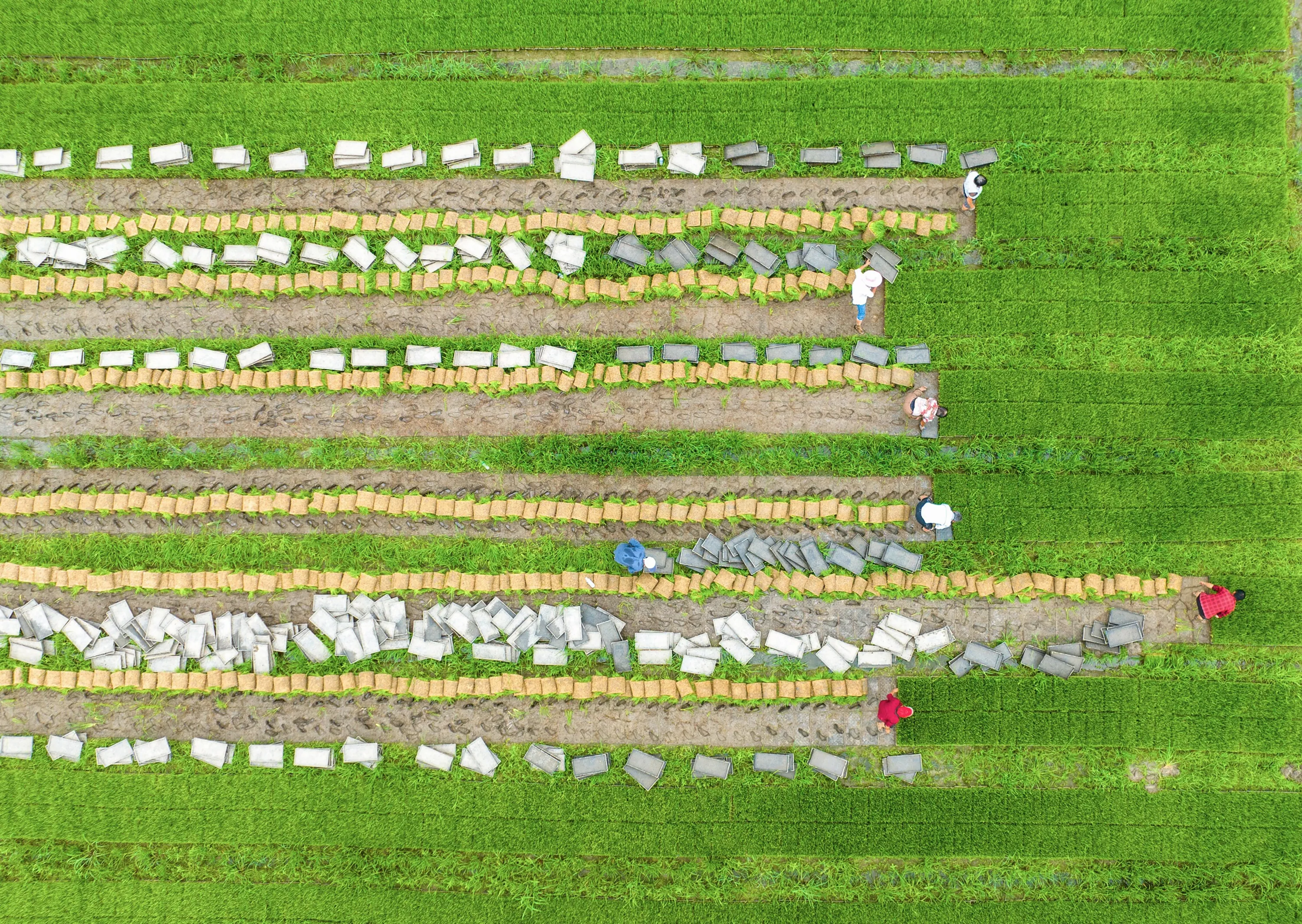 This aerial photo taken on June 27, 2023 shows farmers working at a rice field in Haian, in China's eastern Jiangsu province. (Photo by AFP Photo/China Stringer Network)