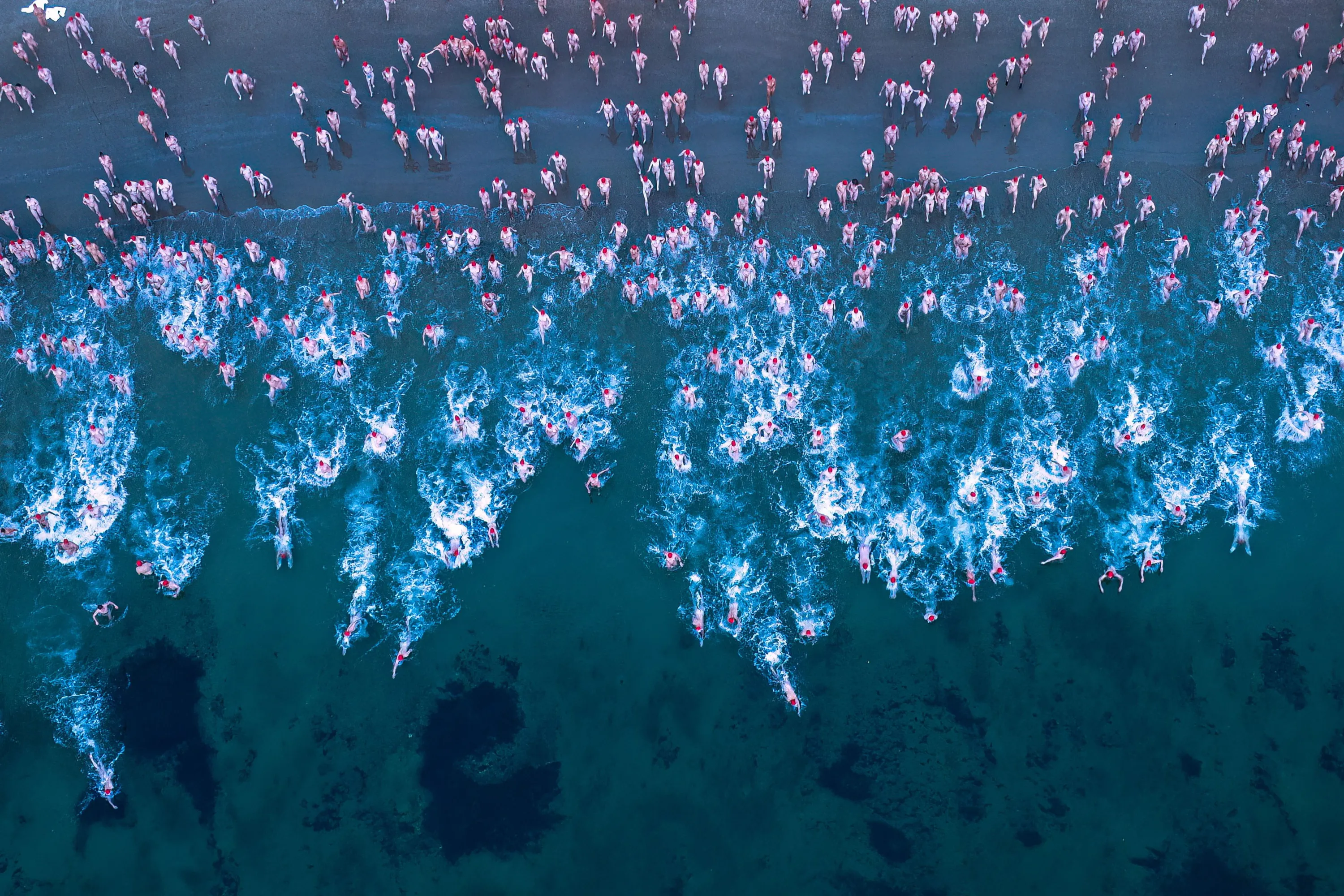 Swimmers participate in the annual nude winter solstice swim during Hobart's Dark Mofo festival at Long Beach in Hobart, Australia on June 22, 2023. (Photo by Rob Blakers/EPA/EFE)