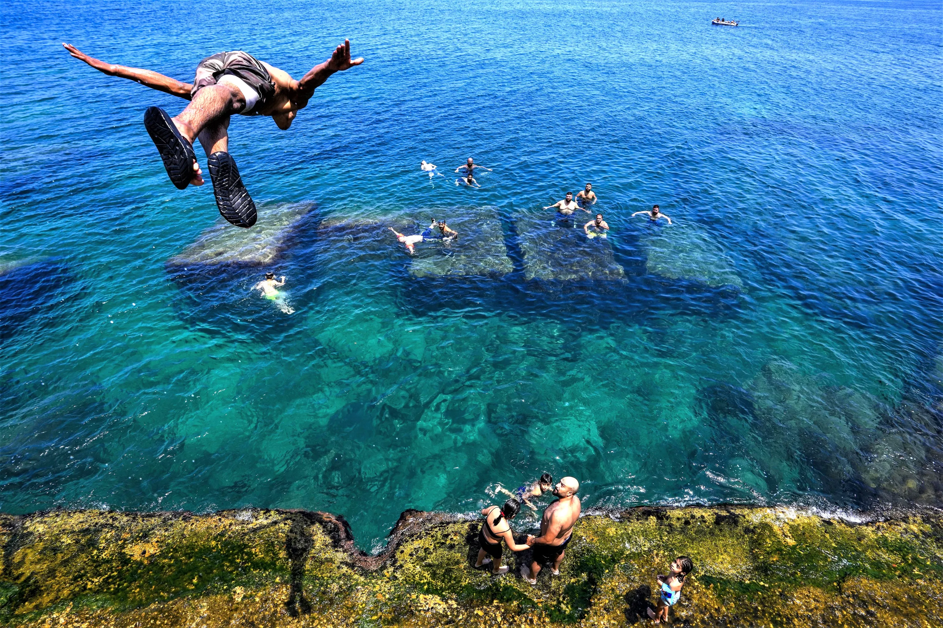 A youth jumps in the water to cool off on a sweltering hot day in the Mediterranean Sea in Beirut, Lebanon, Sunday, July 16, 2023. Were forecast to reach as high as 40 degrees Celsius, 104 Fahrenheit, in some parts of Lebanon. (Photo by Hassan Ammar/AP Photo)