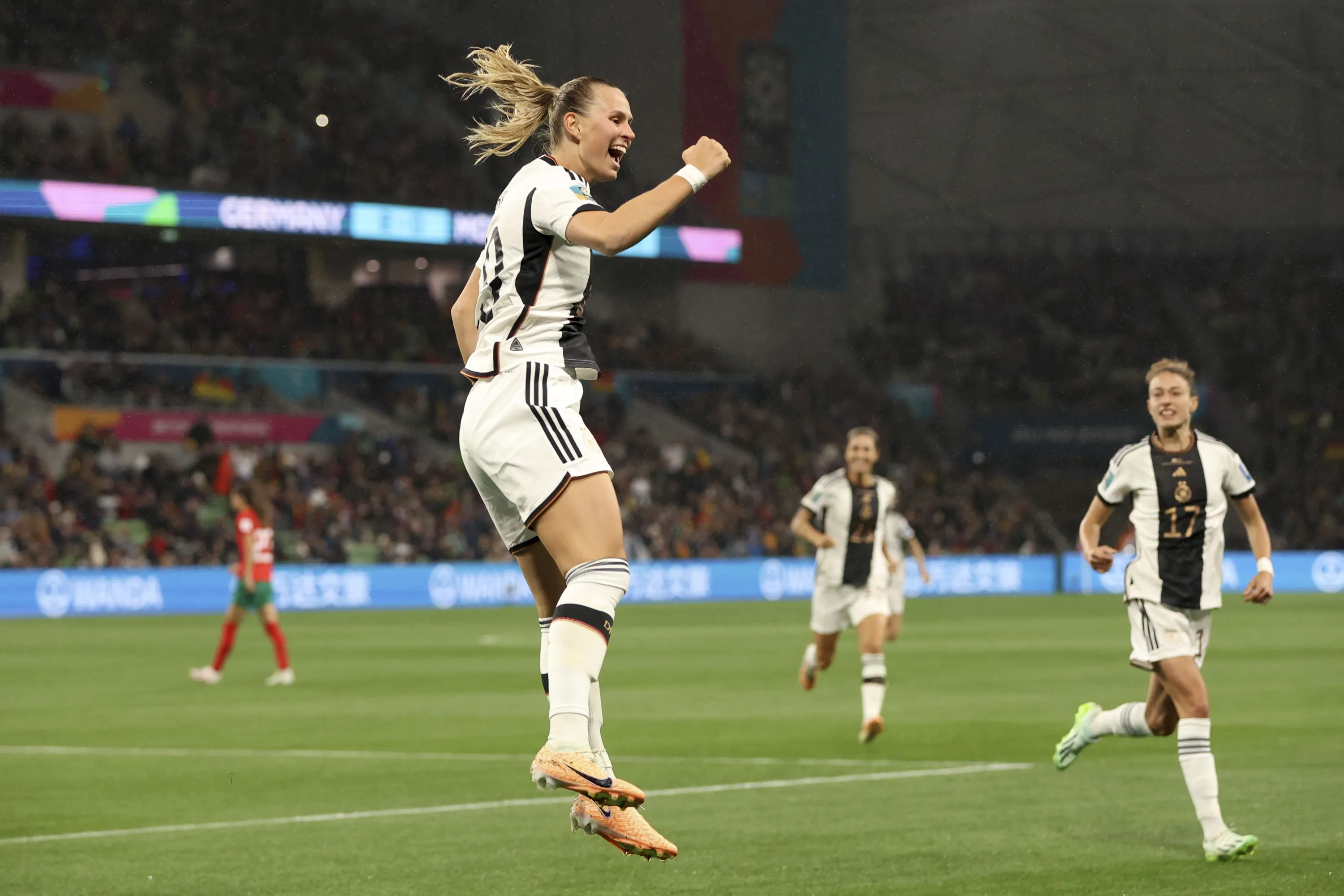 Germany's Klara Buehl, left, celebrates after scoring her side's third goal during the Women's World Cup Group H soccer match between Germany and Morocco in Melbourne, Australia, Monday, July 24, 2023. (Photo by Hamish Blair/AP Photo)