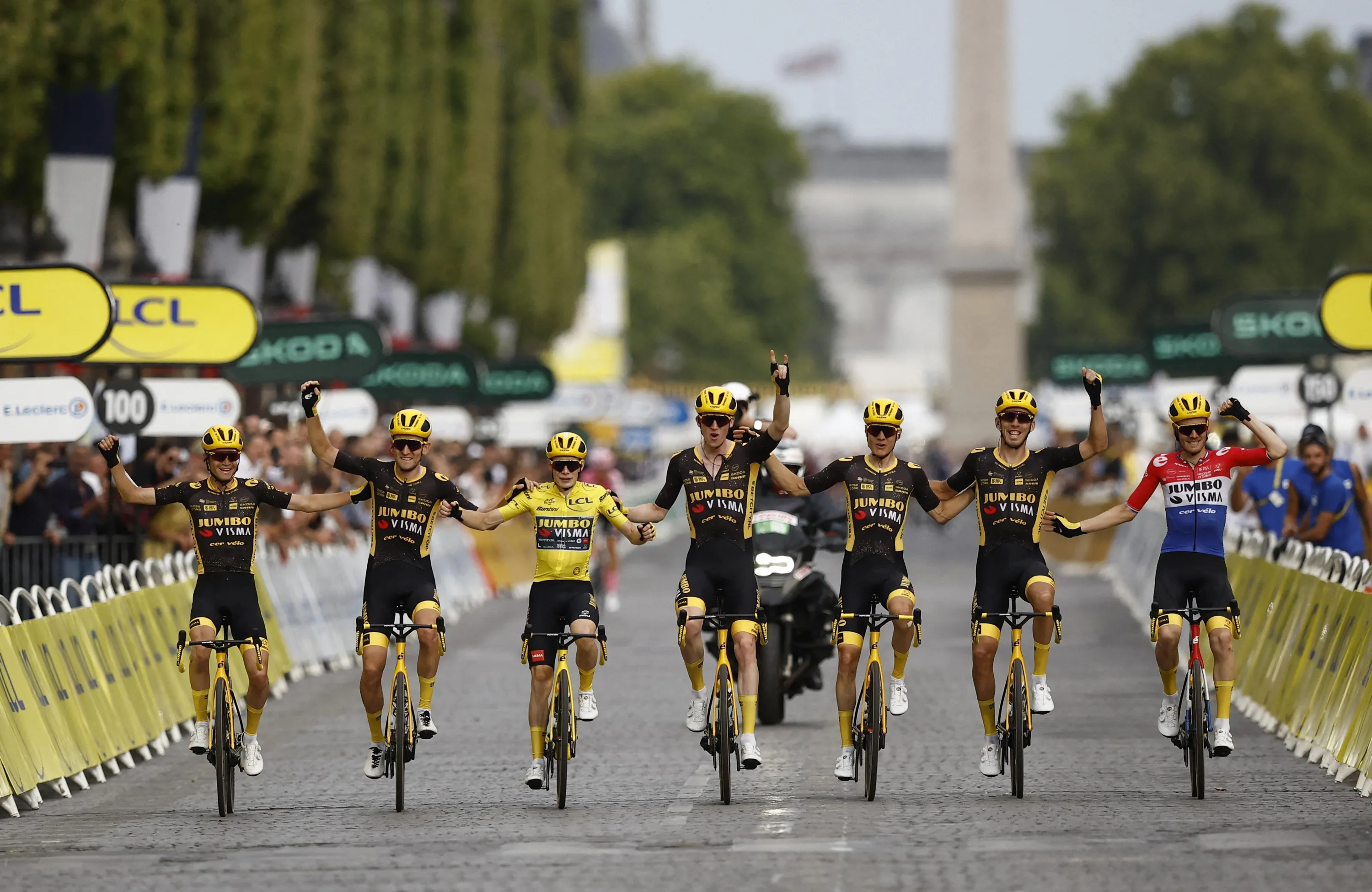Jonas Vingegaard of Denmark – Yellow Leader Jersey, Tiesj Benoot of Belgium, Wilco Kelderman of The Netherlands, Sepp Kuss of The United States, Christophe Laporte of France, Dylan Van Baarle of The Netherlands, Nathan Van Hooydonck of Belgium and Team Jumbo-Visma celebrate after the stage twenty-one of the 110th Tour de France 2023 a 11 5.1km stage from Saint-Quentin-en-Yvelines to Paris / #UCIWT / on July 23, 2023 in Paris, France. (Photo by Stephane Mahe/Reuters)