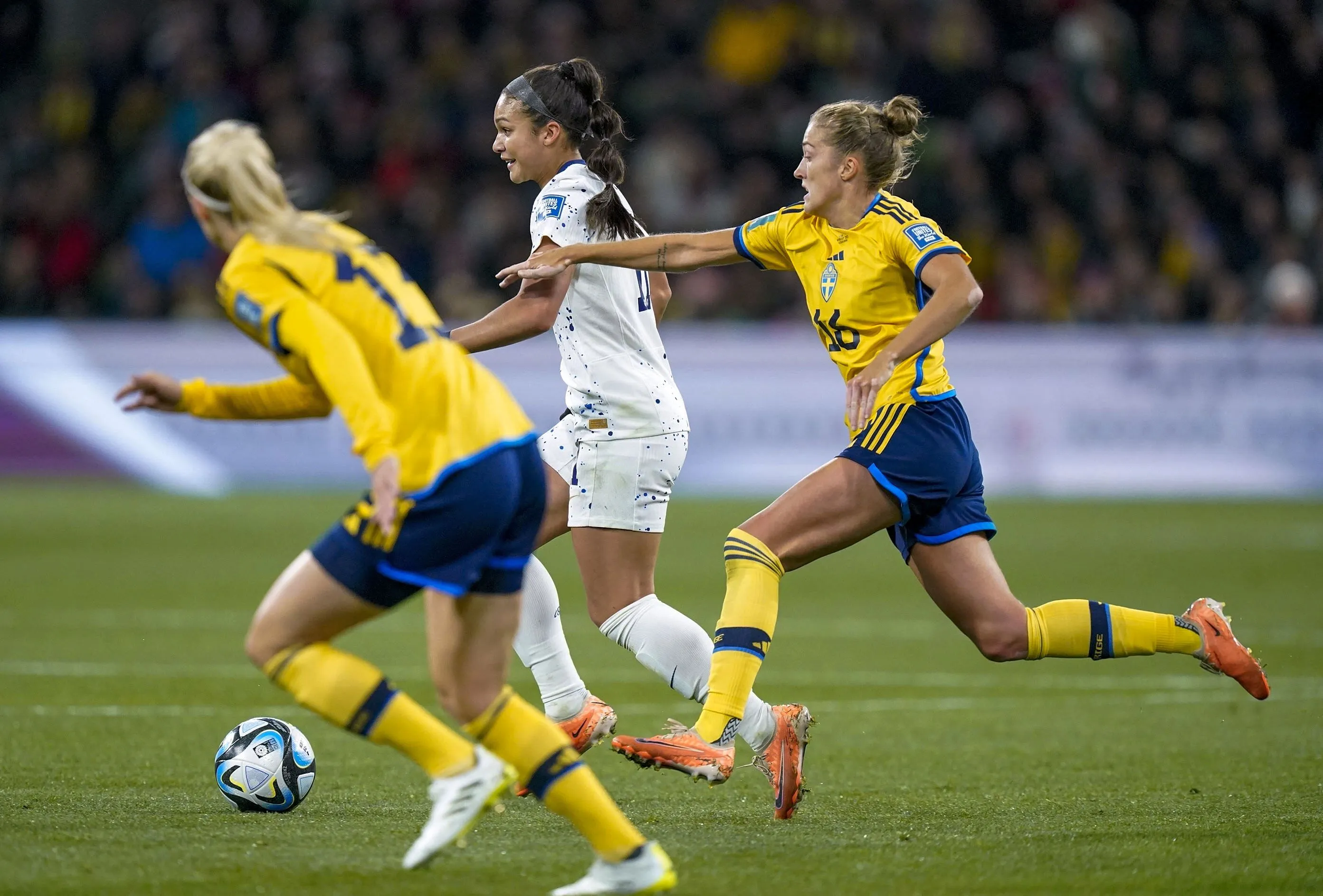 Sweden midfielder Filippa Angeldahl (16) reaches after United States forward Sophia Smith (11) as she brings the ball downfield during the 2023 FIFA World Cup in Melbourne Rectangular Stadium in Melbourne, Australia on August 6, 2023. (Photo by Jabin Botsford/The Washington Post)