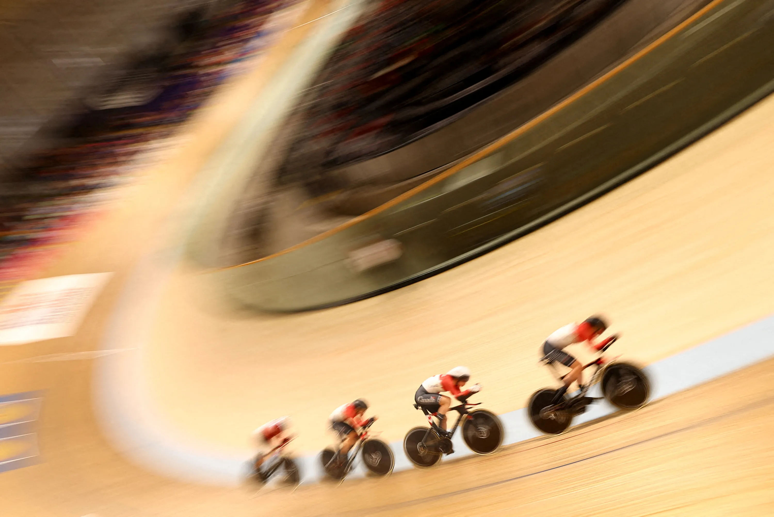 Canada's Maggie Coles-Lyster, Sarah van Dam, Erin J Attwell, Ariane Bonhomme in action during the women's elite team pursuit qualifiers at the Emirates Arena in Glasgow, Scotland on August 4, 2023. (Photo by Matthew Childs/Reuters)