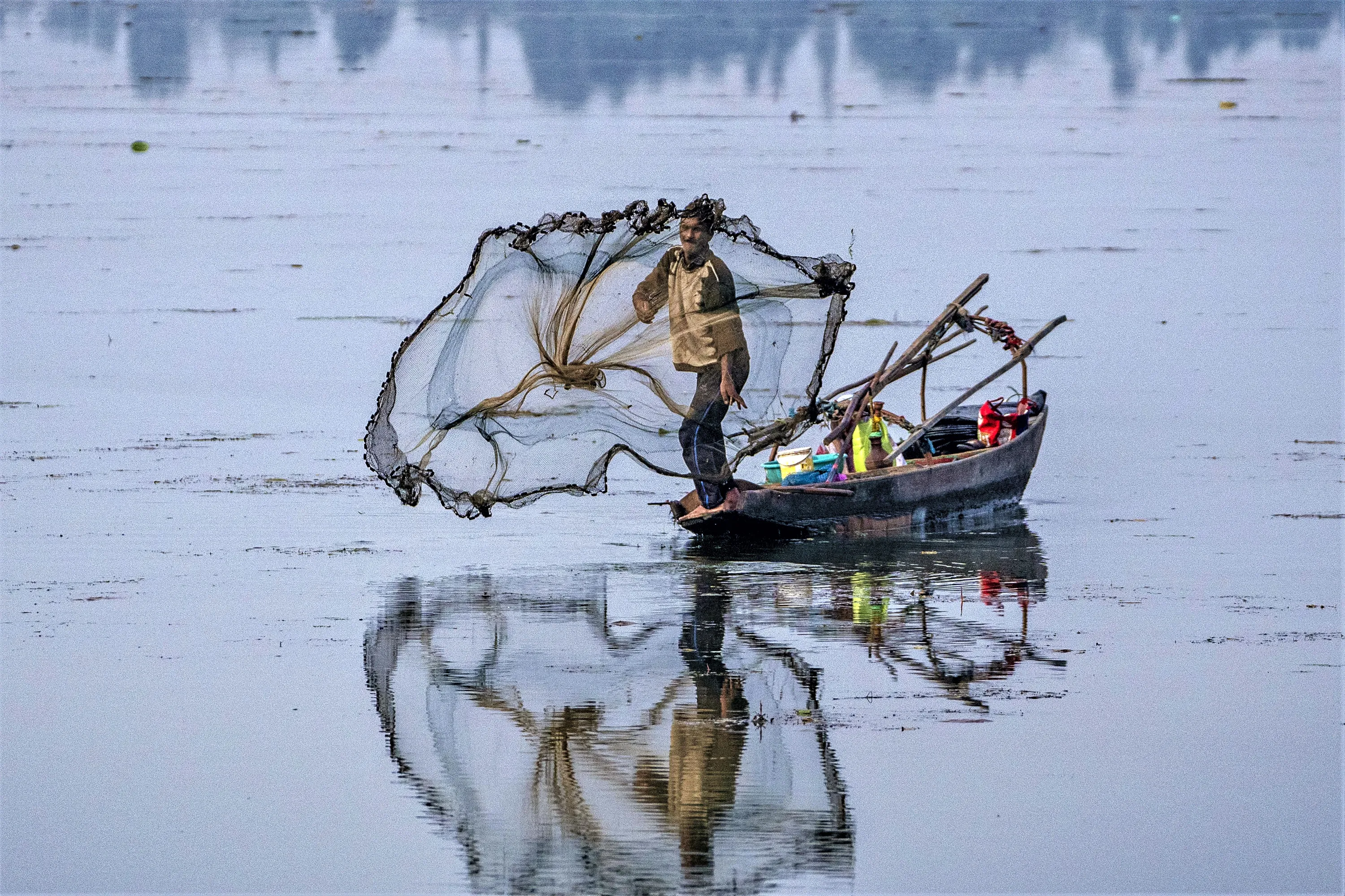 A Kashmiri fisherman casts his net into the waters of the Dal Lake on the outskirts of Srinagar, Indian controlled Kashmir, Tuesday, August 29, 2023. (Photo by Dar Yasin/AP Photo)