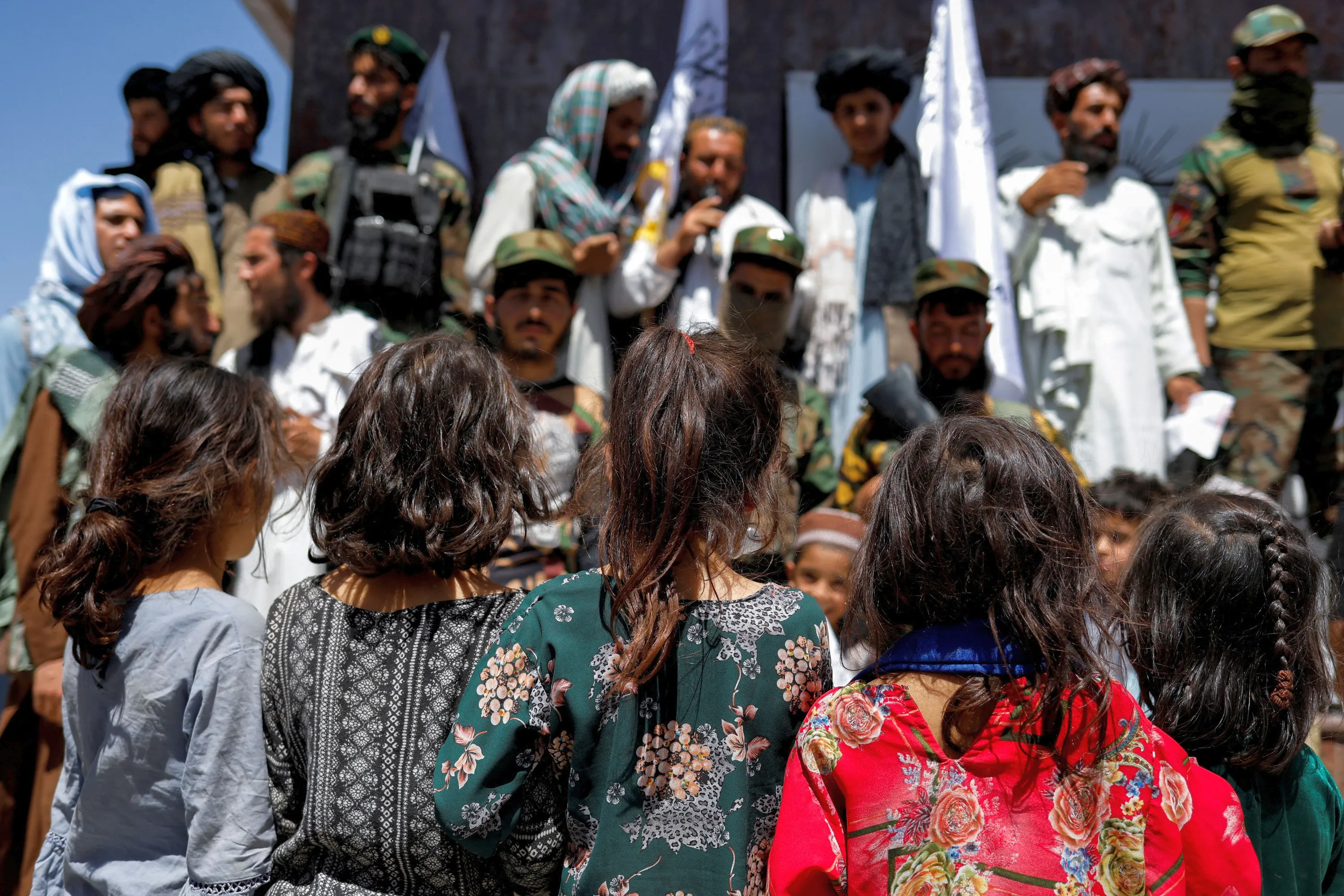 Afghan girls look at Taliban supporters on the second anniversary of the fall of Kabul on a street near the US embassy in Kabul, Afghanistan on August 15, 2023. (Photo by Ali Khara/Reuters)