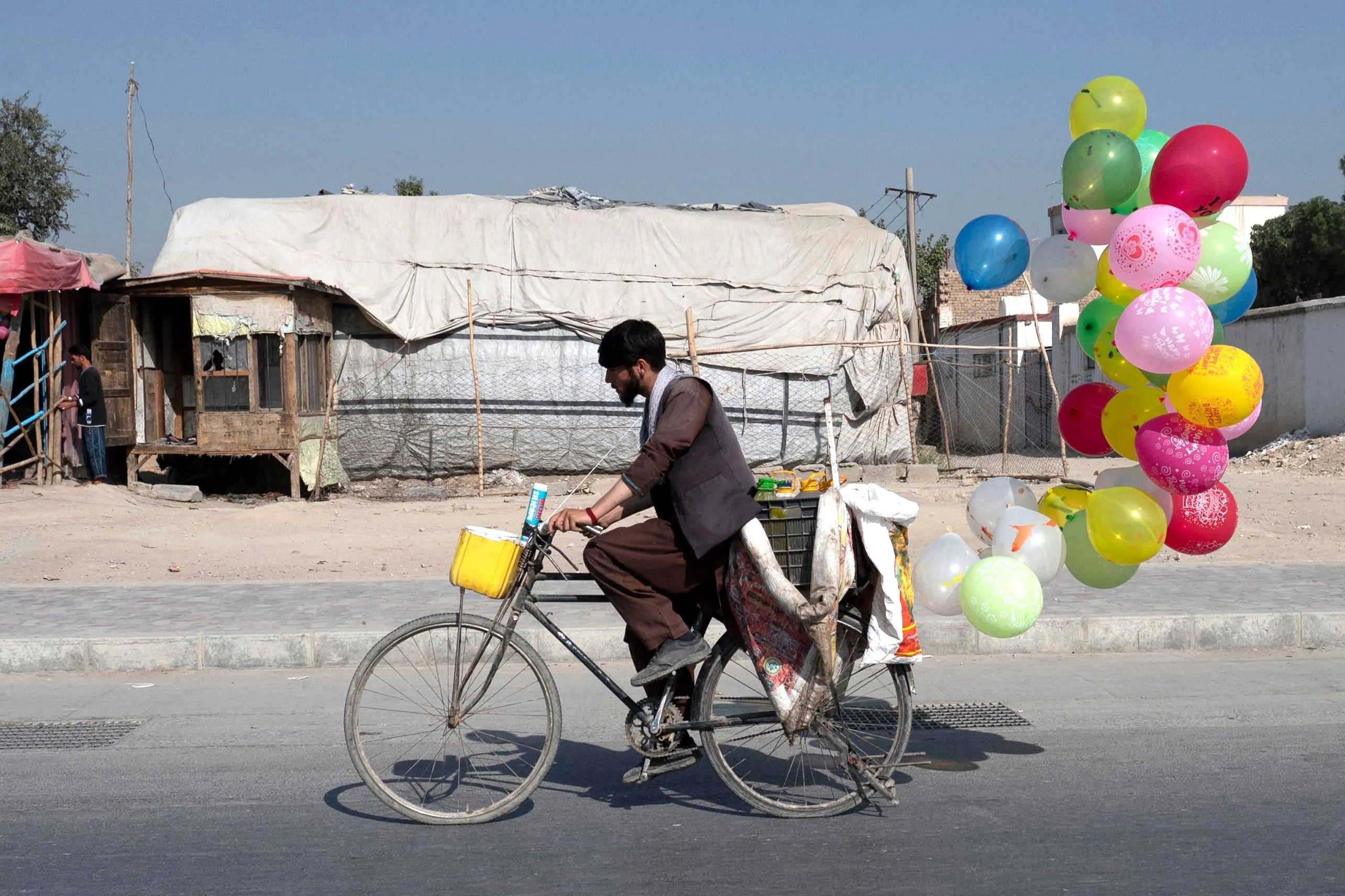 An Afghan balloon vendor rides a bicycle along a street in Kabul on August 31, 2023. (Photo by Wakil Kohsar/AFP Photo)