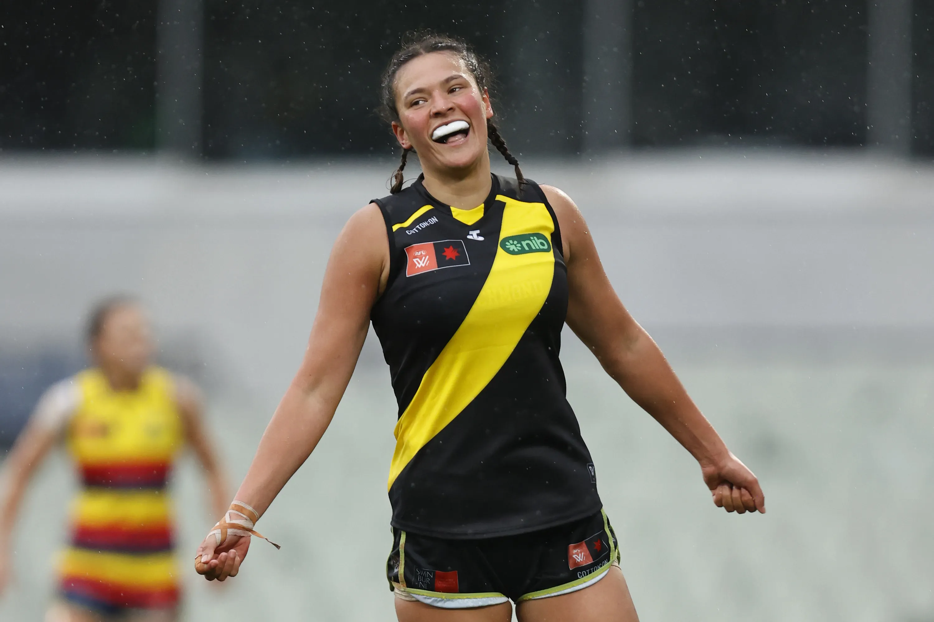 Poppy Kelly of Richmond celebrates a goal during the round two AFLW match between Richmond Tigers and Adelaide Crows at Ikon Park, on September 08, 2023, in Melbourne, Australia. (Photo by Darrian Traynor/AFL Photos/via Getty Images)