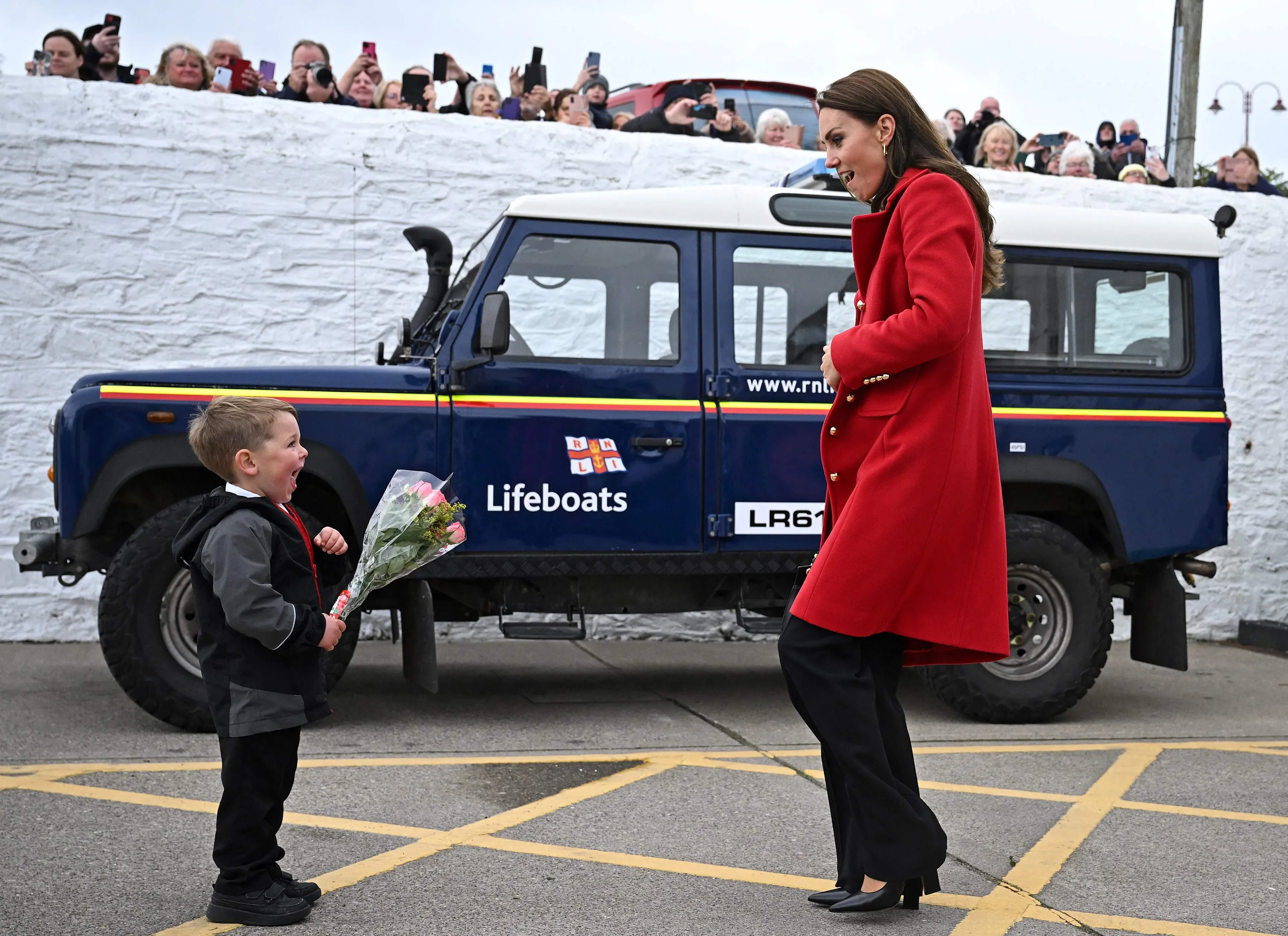 Britain's Catherine, Princess of Wales reacts as she is presented with a posy of flowers by four-year-old Theo Crompton during a visit to the RNLI (Royal National Lifeboat Institution) Holyhead Lifeboat Station in Anglesey, north west Wales on September 27, 2022. (Photo by Paul Ellis/Pool via AFP Photo)