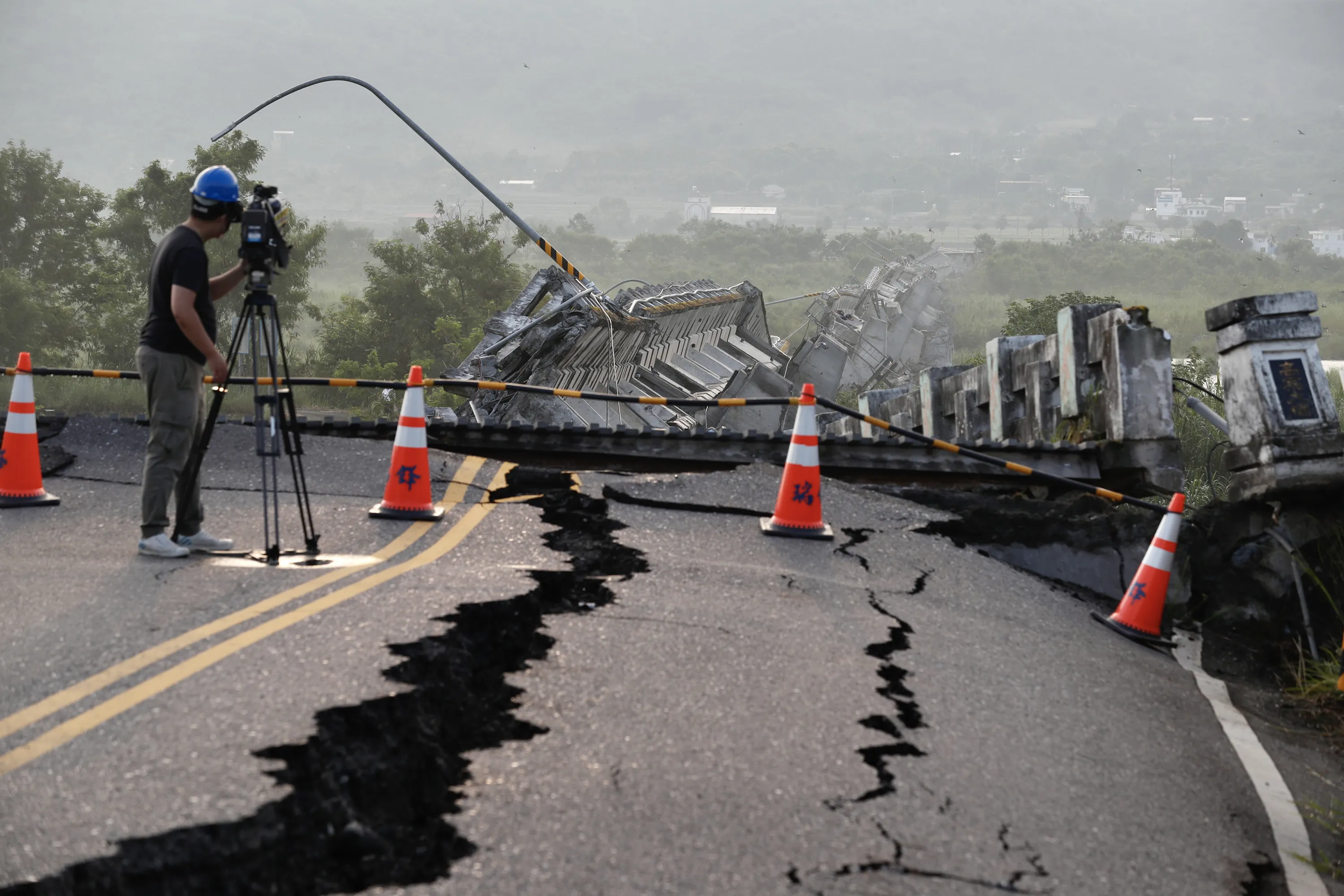 A journalist films the damaged Gaoliao bridge that collapsed after a magnitude 6.8 earthquake hit Yuli Township; in Hualien County, Taiwan, 19 September 2022. The series of earthquakes and aftershocks on 18 September, caused minor structural damage and derailed a train in eastern Taiwan. (Photo by Ritchie B. Tongo/EPA/EFE)