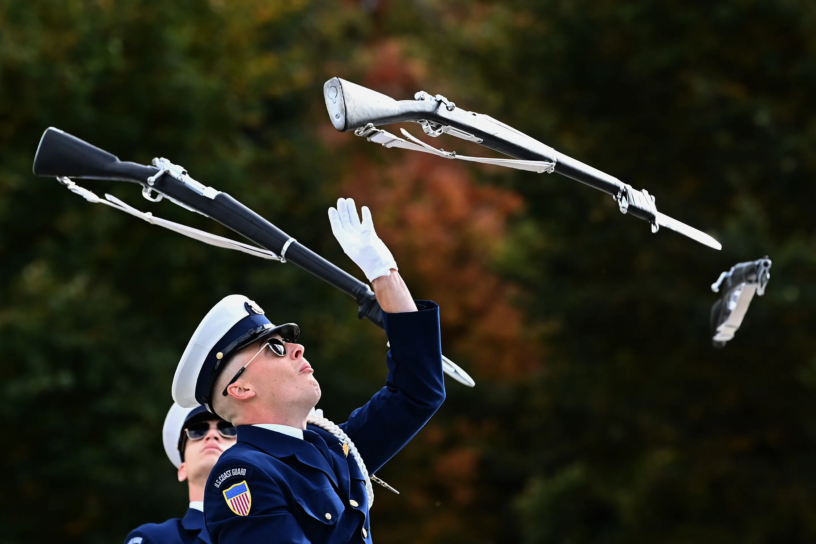 Coasties, part of the U.S. Coast Guard Drill Team perform during the Joint Services Drill-Off on the National Mall October 19, 2022 in Washington, DC. The Marines took the top prize in the Joint Services Drill competition that also included the U.S. Air Force, Army, Navy and Coast Guard. (Photo by Katherine Frey/The Washington Post)