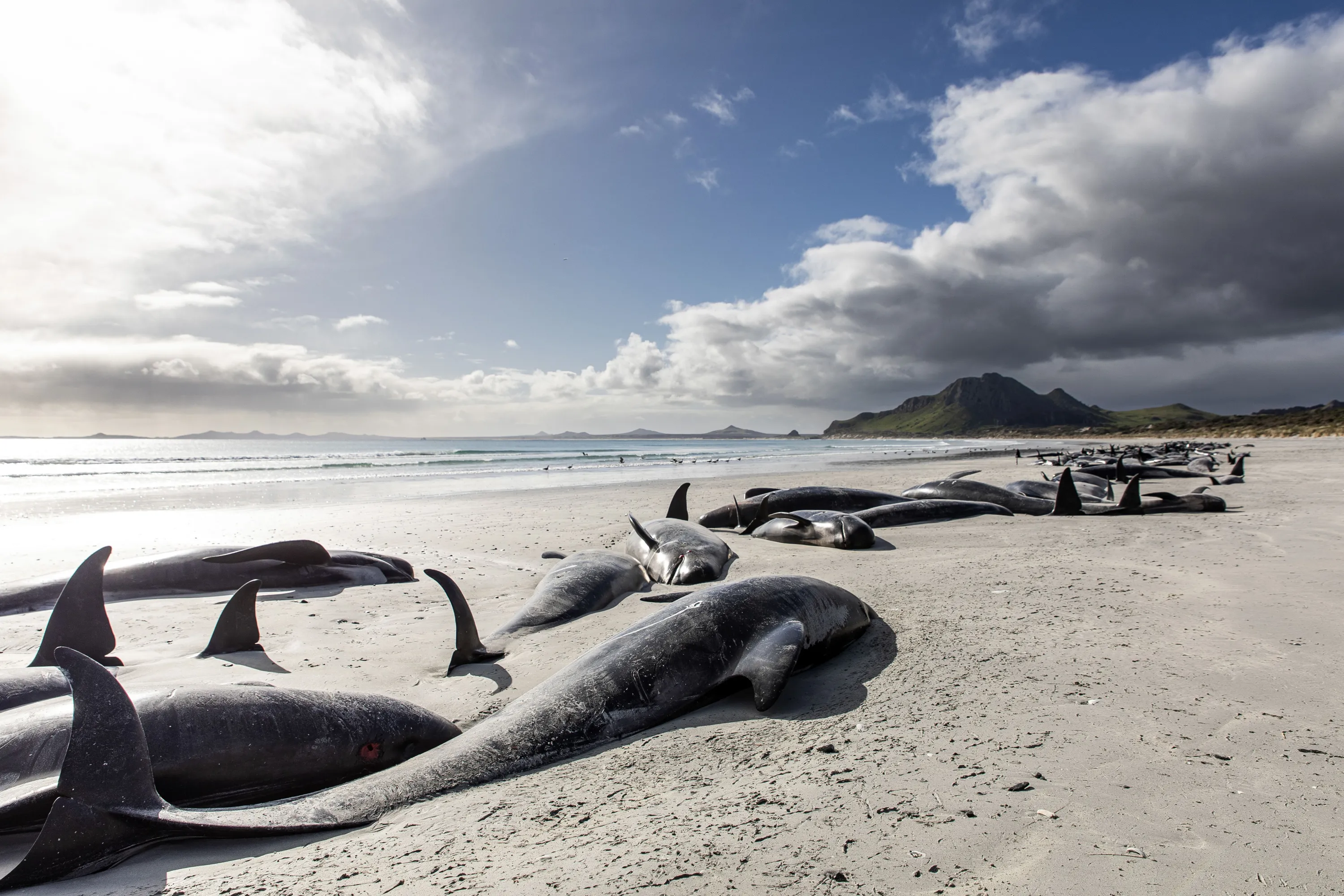 A string of dead pilot whales line the beach at Tupuangi Beach, Chatham Islands, in New Zealand's Chatham Archipelago, Saturday, October 8, 2022. Some 477 pilot whales have died after stranding themselves on two remote New Zealand beaches over recent days, officials say. (Photo by Tamzin Henderson via AP Photo)
