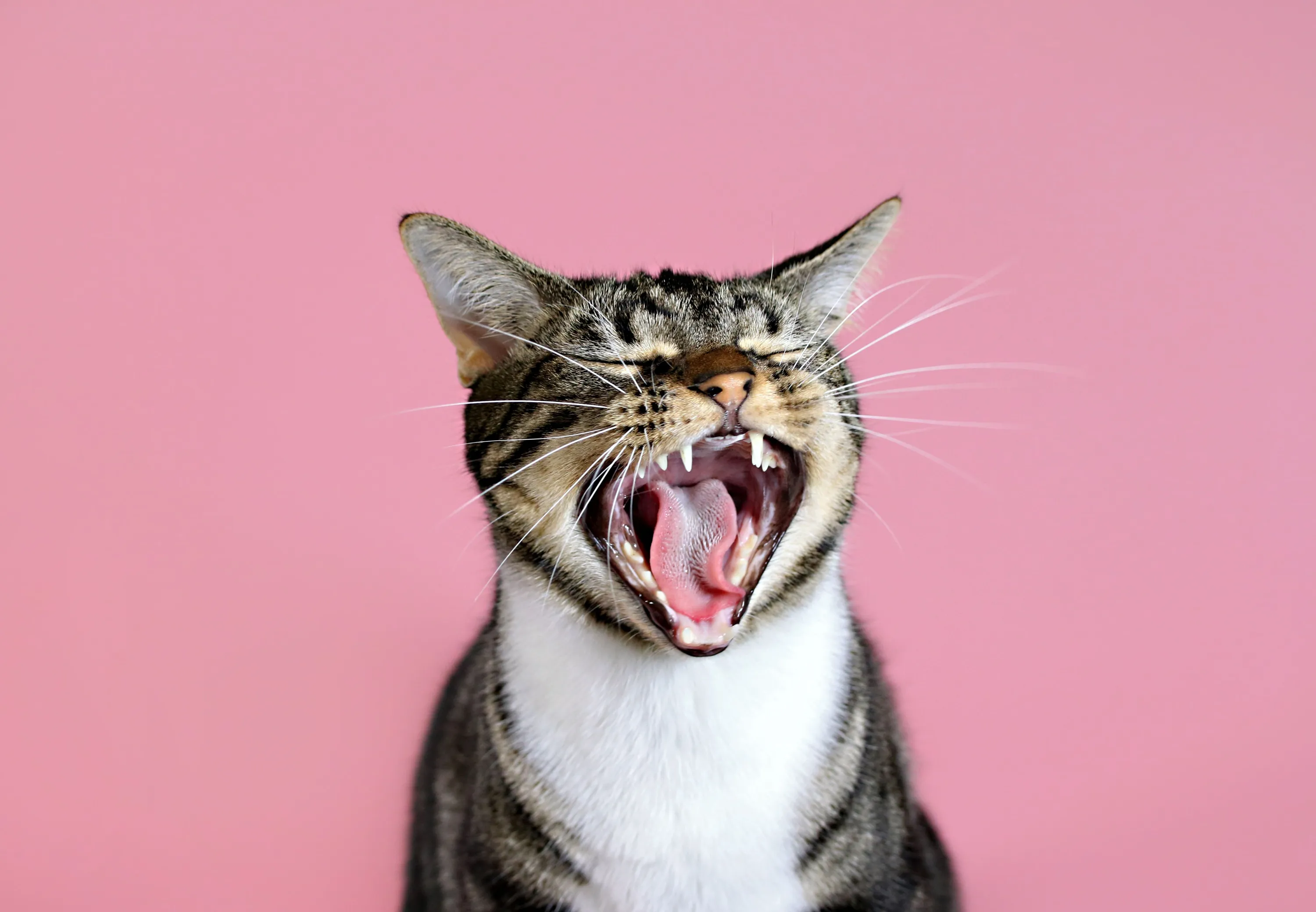 Cat yawning laughing with pink background. (Photo by Kelly Bowden/Getty Images)