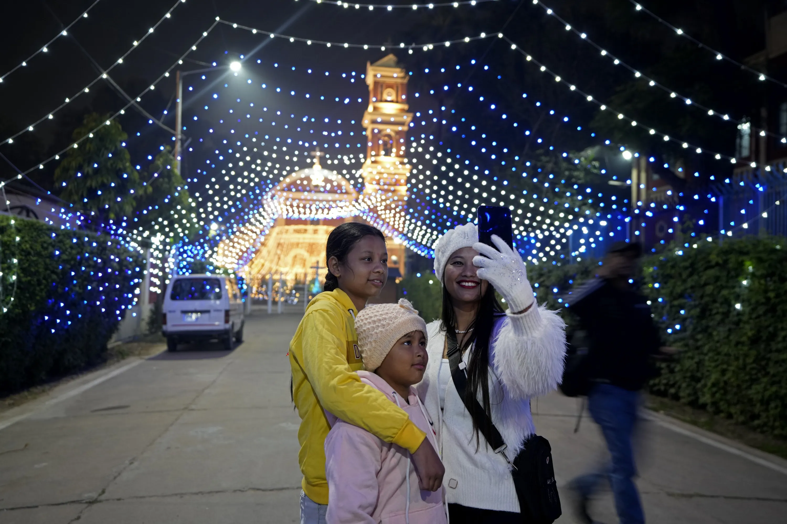 People take selfies in front of the decorated St. Joseph's Cathedral on the eve of Christmas in Prayagraj, India, Sunday, December 24, 2023. Although Christians comprise only two percent of the population Christmas is a national holiday and is observed across the country as an occasion to celebrate. (Photo by Rajesh Kumar Singh/AP Photo)