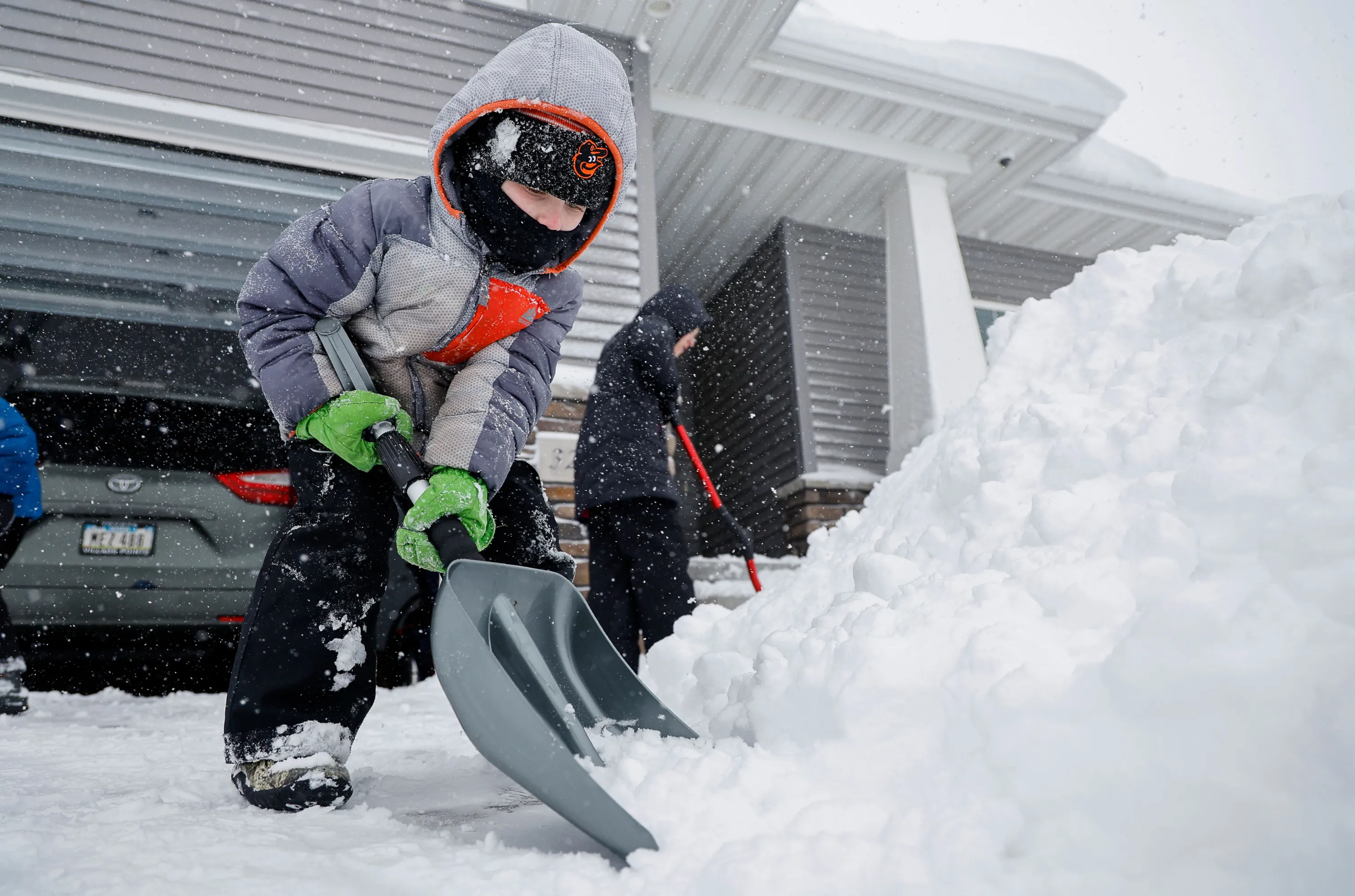 Four-year-old Edwin Tomlinson shovels the driveway with his brother and sisters in Fairfax on January 14, 2024. (Photo by Jim Slosiarek/AP Photo)