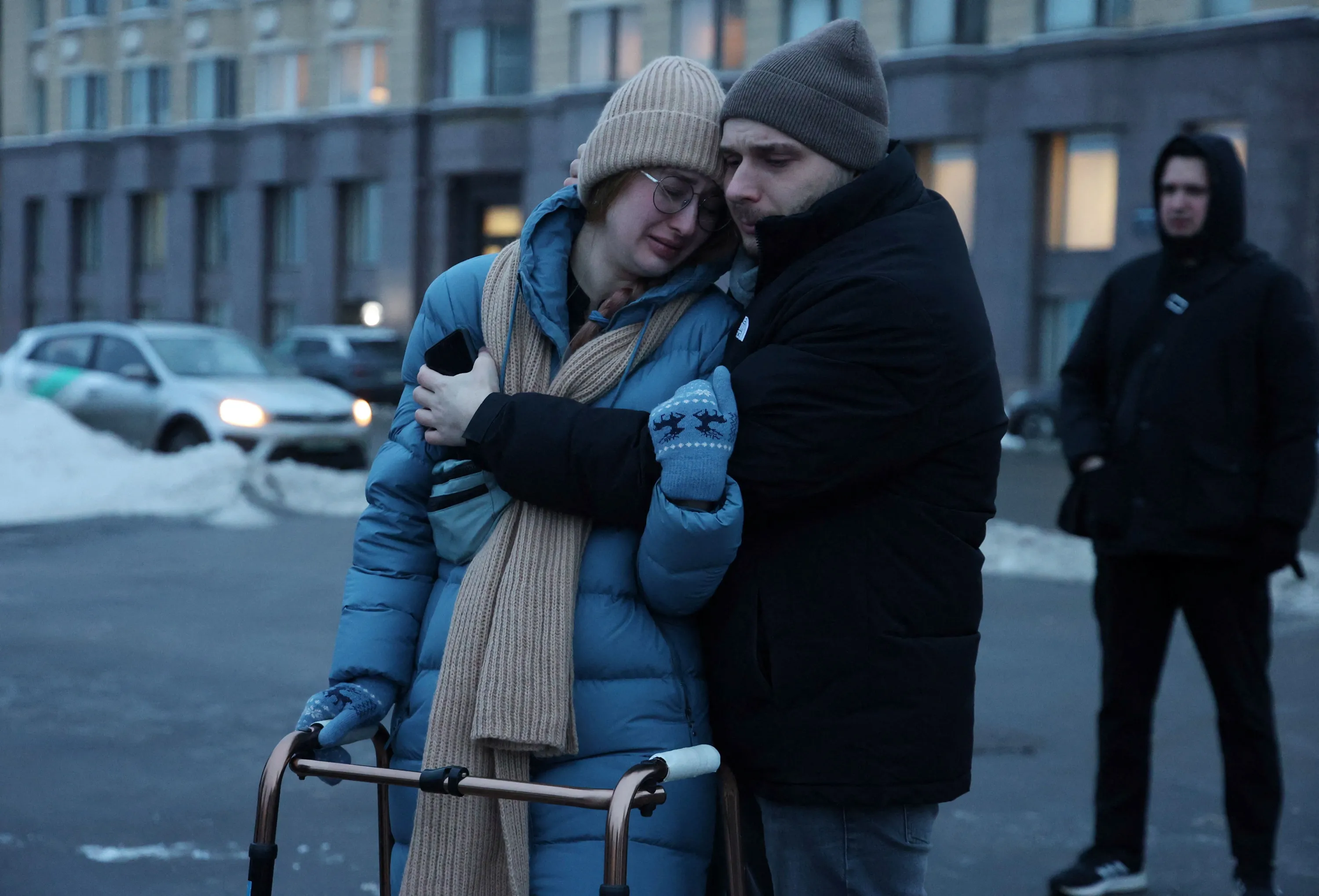 People react next to the monument to the victims of political repression in Saint Petersburg, Russia on February 16, 2024. (Photo by Reuters/Stringer)