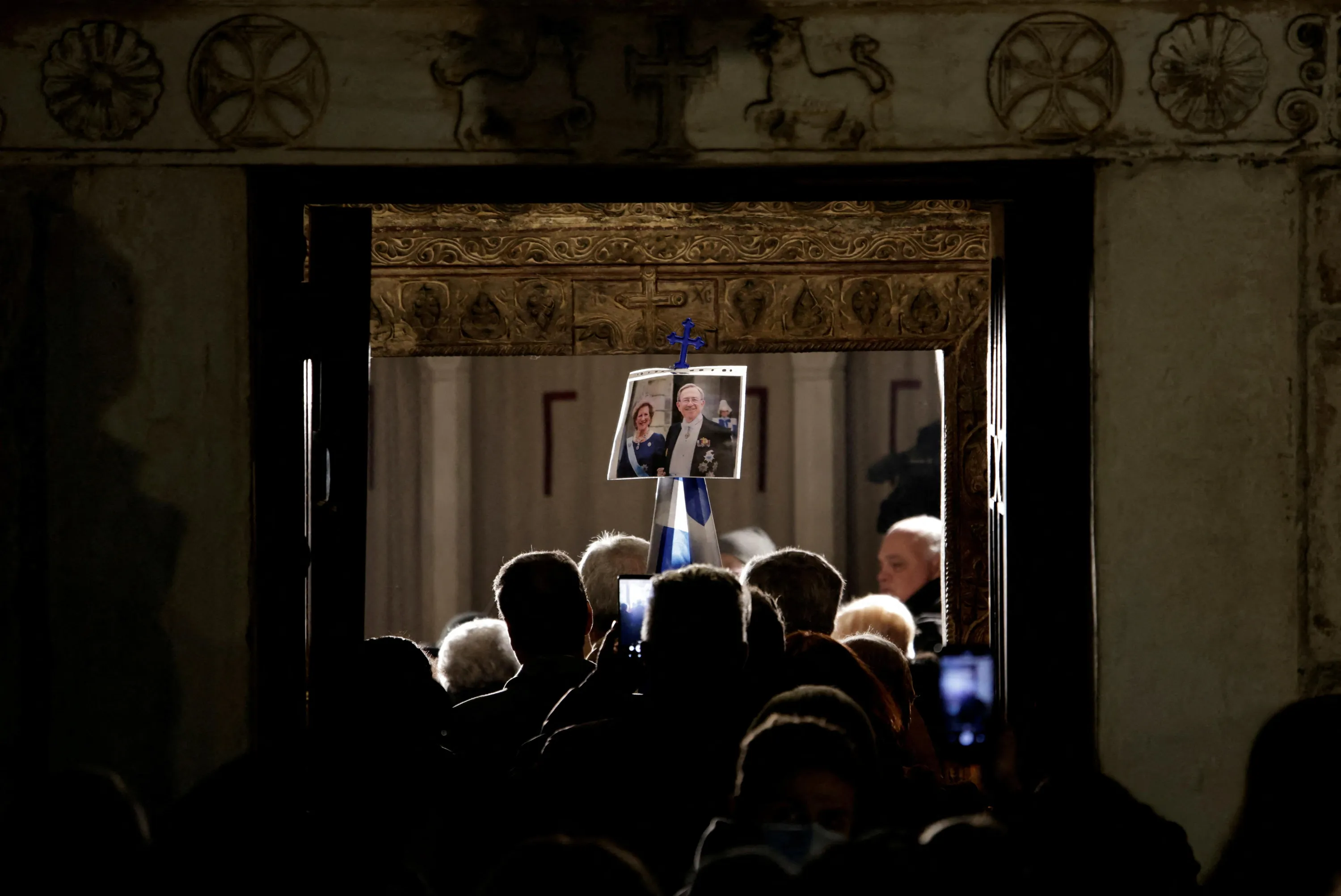 A photo of the late former King of Greece Constantine II and his wife Anne-Marie hangs on a Greek national flag as people line up to pay their respects at Saint Eleftherios chapel, where he lies at rest before the funeral service, in Athens, Greece on January 16, 2023. (Photo by Alkis Konstantinidis/Reuters)