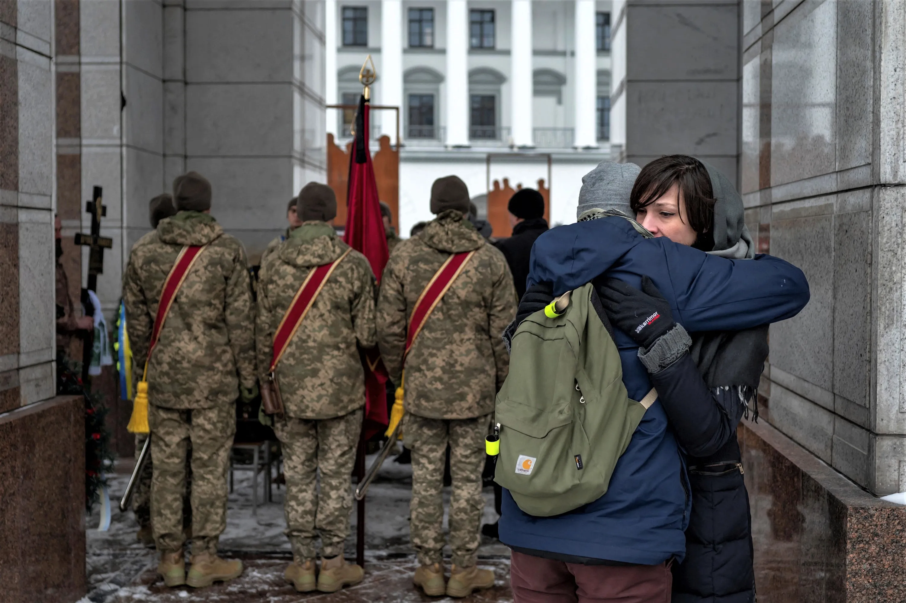 People react during a funeral ceremony for Denys Halushko, Ukrainian serviceman who was recently killed in a fight against Russian troops, amid Russia's attack on Ukraine, at the Independence Square in Kyiv, Ukraine on January 12, 2023. (Photo by Viacheslav Ratynskyi/Reuters)