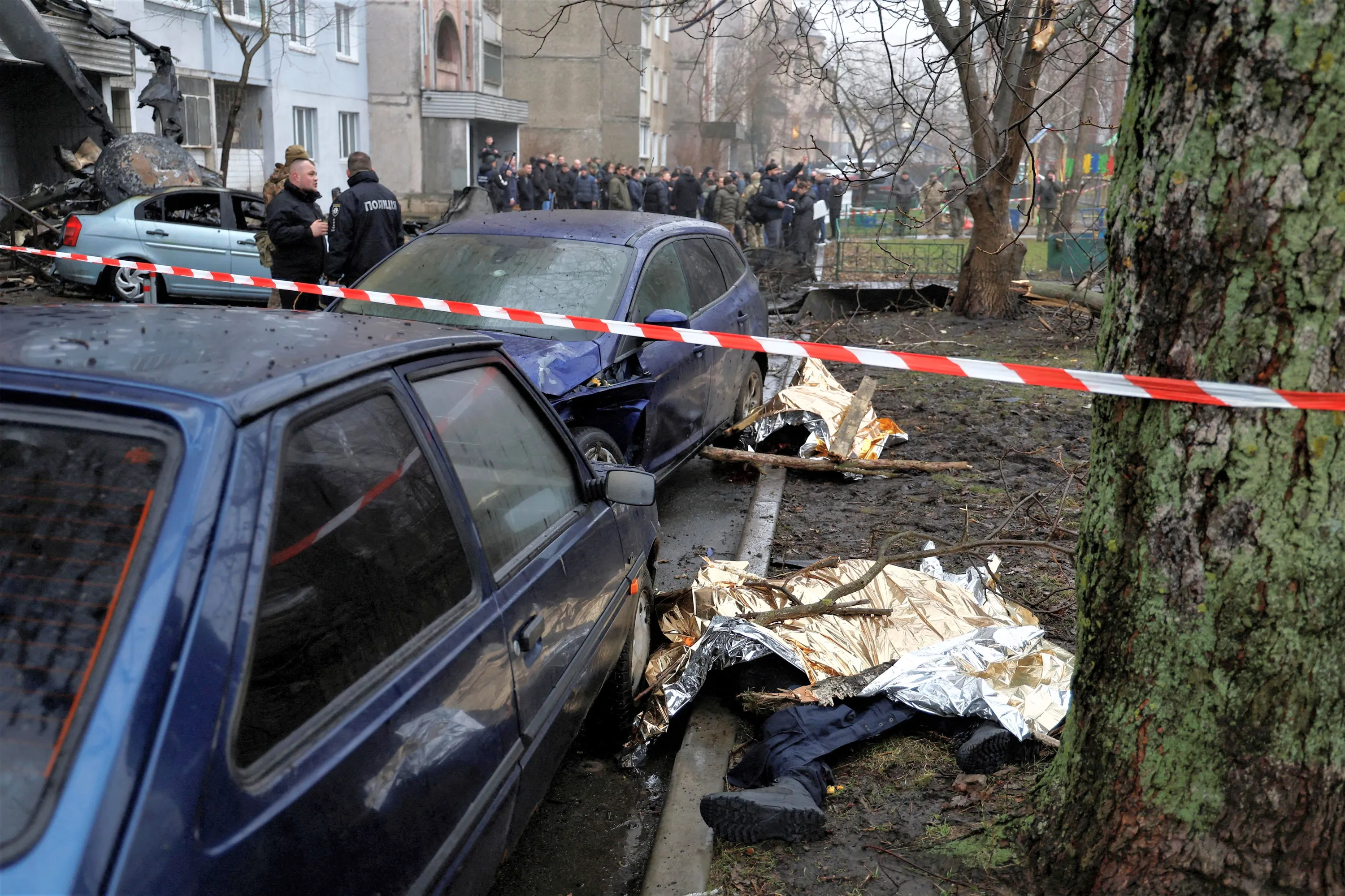Dead bodies lie on the ground at the site where a helicopter falls on civil infrastructure buildings, amid Russia's attack on Ukraine, in the town of Brovary, outside Kyiv, Ukraine on January 18, 2023. (Photo by Valentyn Ogirenko/Reuters)