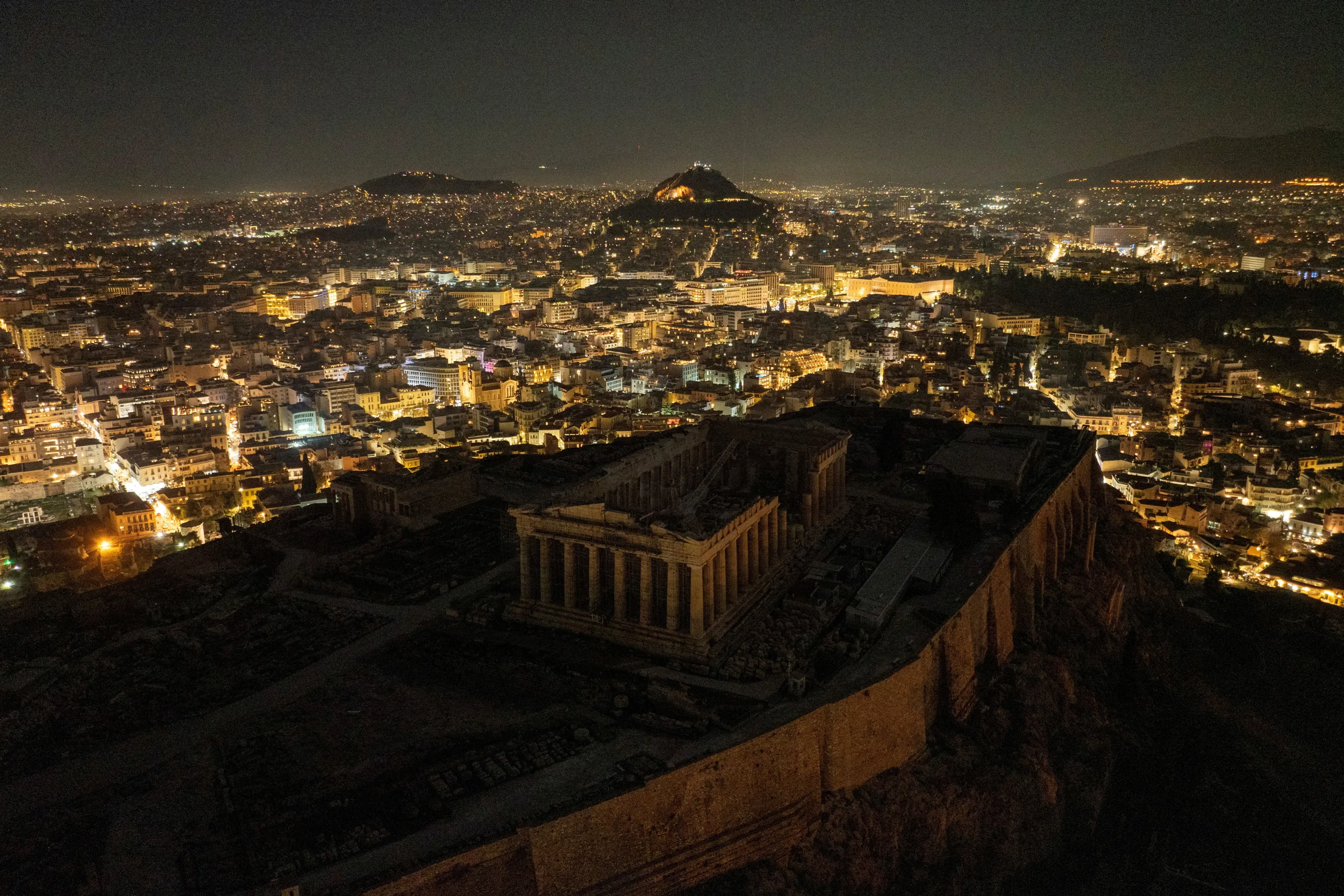 A drone view shows the ruins of the ancient Parthenon temple atop the Acropolis hill with the lights turned off during Earth Hour, in Athens, Greece, on March 23, 2024. (Photo by Stelios Misinas/Reuters)