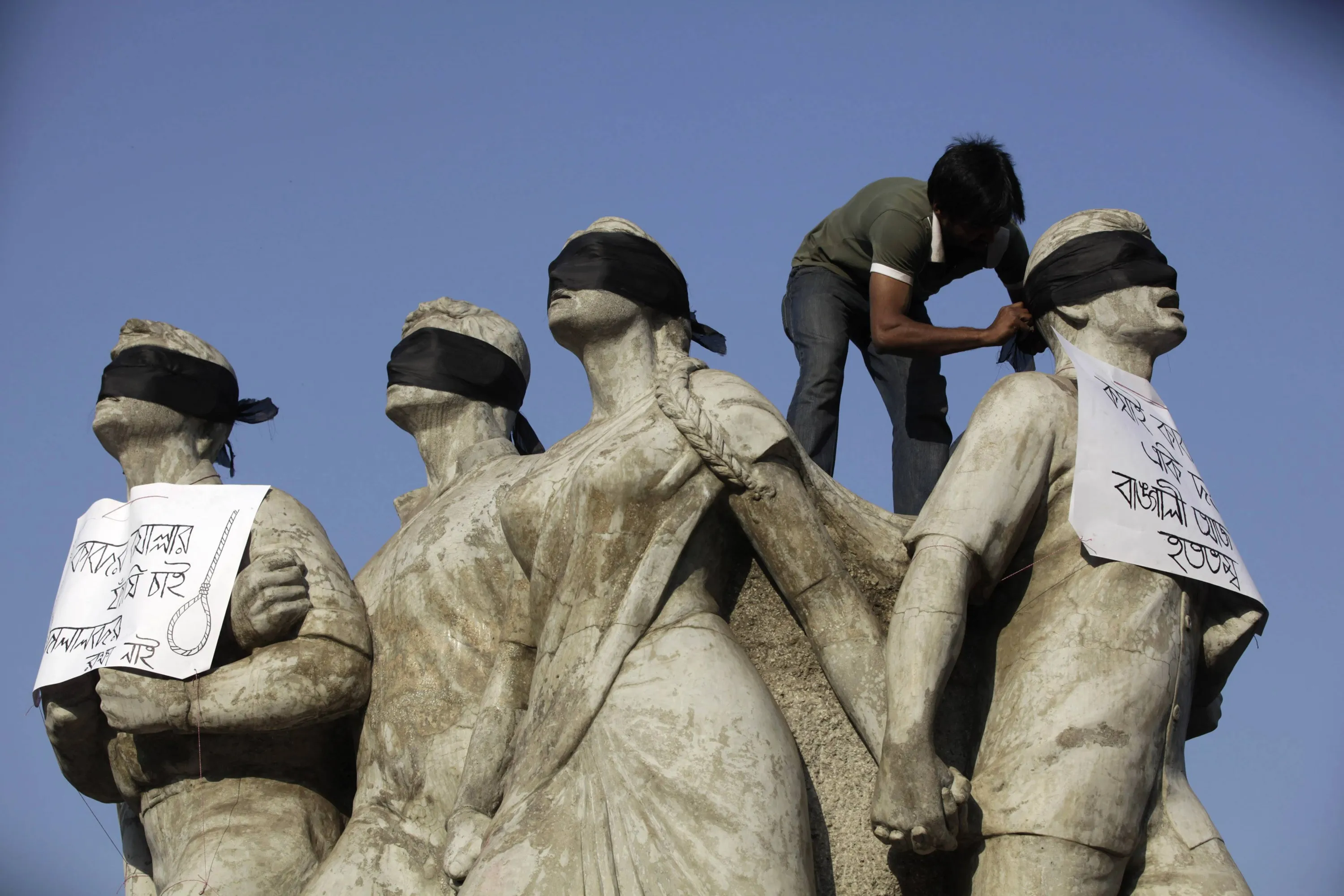 A student activist puts black scarves on the eyes of Shoparjito Shadhinota, a sculpture that represented all sections of people in Bangladesh's liberation War in 1971, demanding capital punishment for Bangladesh's Jamaat-e-Islami senior leader Abdul Quader Mollah, after a war crimes tribunal sentenced him to life imprisonment, in the campus of University of Dhaka February 6, 2013. The war crimes tribunal sentenced Quader Mollah, 64, to life in prison on Tuesday, the second verdict in trials that have reopened wounds about the country's independence war and sparked riots. He was found guilty of charges including murder, rape, torture and arson during Bangladesh's war to break away from Pakistan in 1971. (Photo by Andrew Biraj/Reuters)