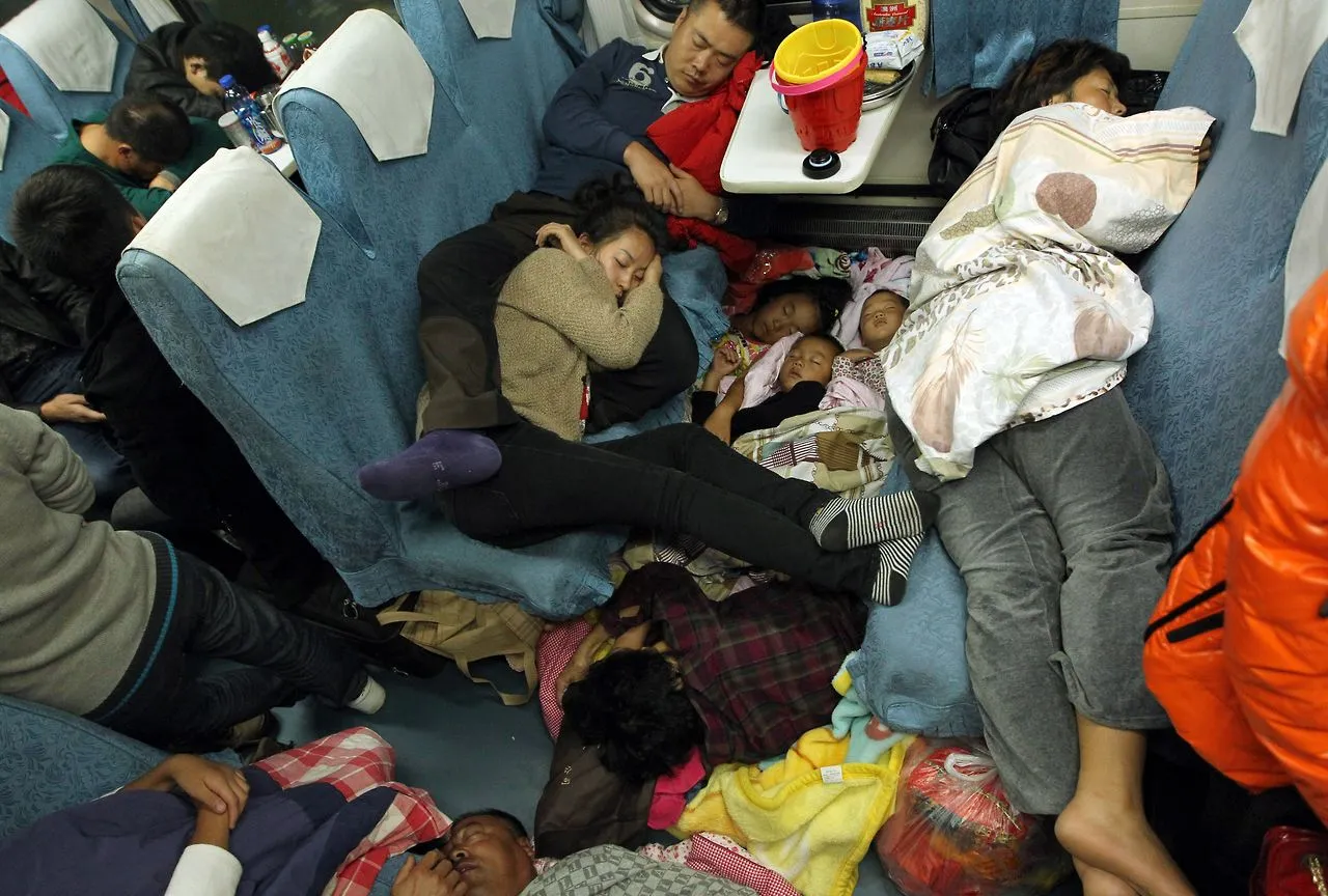 People sleep on their seats on the train from Guangzhou to Changchun to go back home for the Lunar New Year, or Spring Festival, on February 6, 2013. Passengers will log 220 million train rides during the 40-day travel season as they criss-cross the country to celebrate with their families, but just as making the trip home can be laborious – often lasting one or two days – so can simply acquiring a seat on the train, and every year complaints arise about the inefficiency or unfairness of the system, although an initiative allowing travelers to purchase tickets online aims to curb long queuing times. (Photo by China Photo Press)