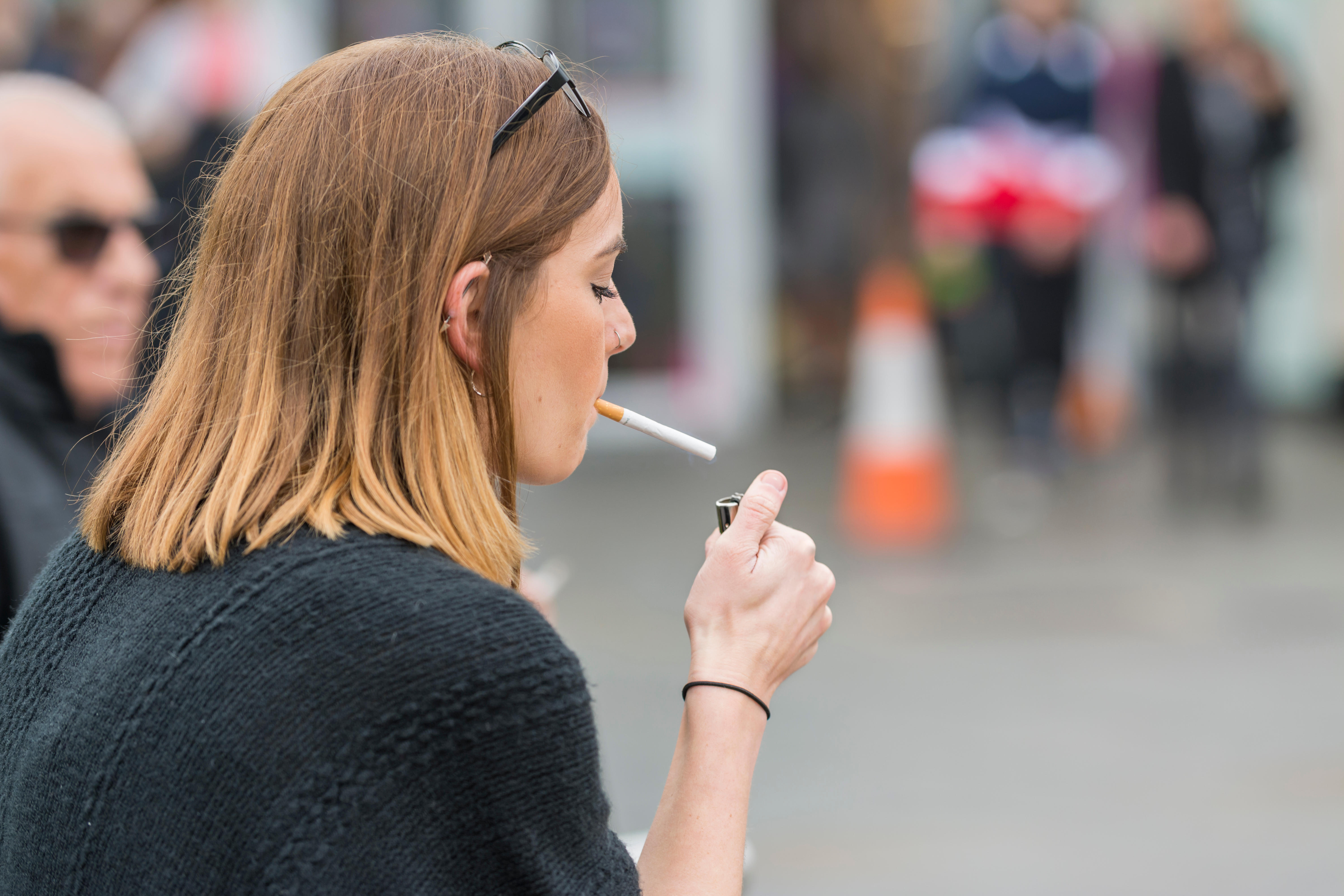 Young Caucasian woman lighting a cigarette in the United Kingdom. Unhealthy lifestyle. (Photo by Alamy Stock Photo)