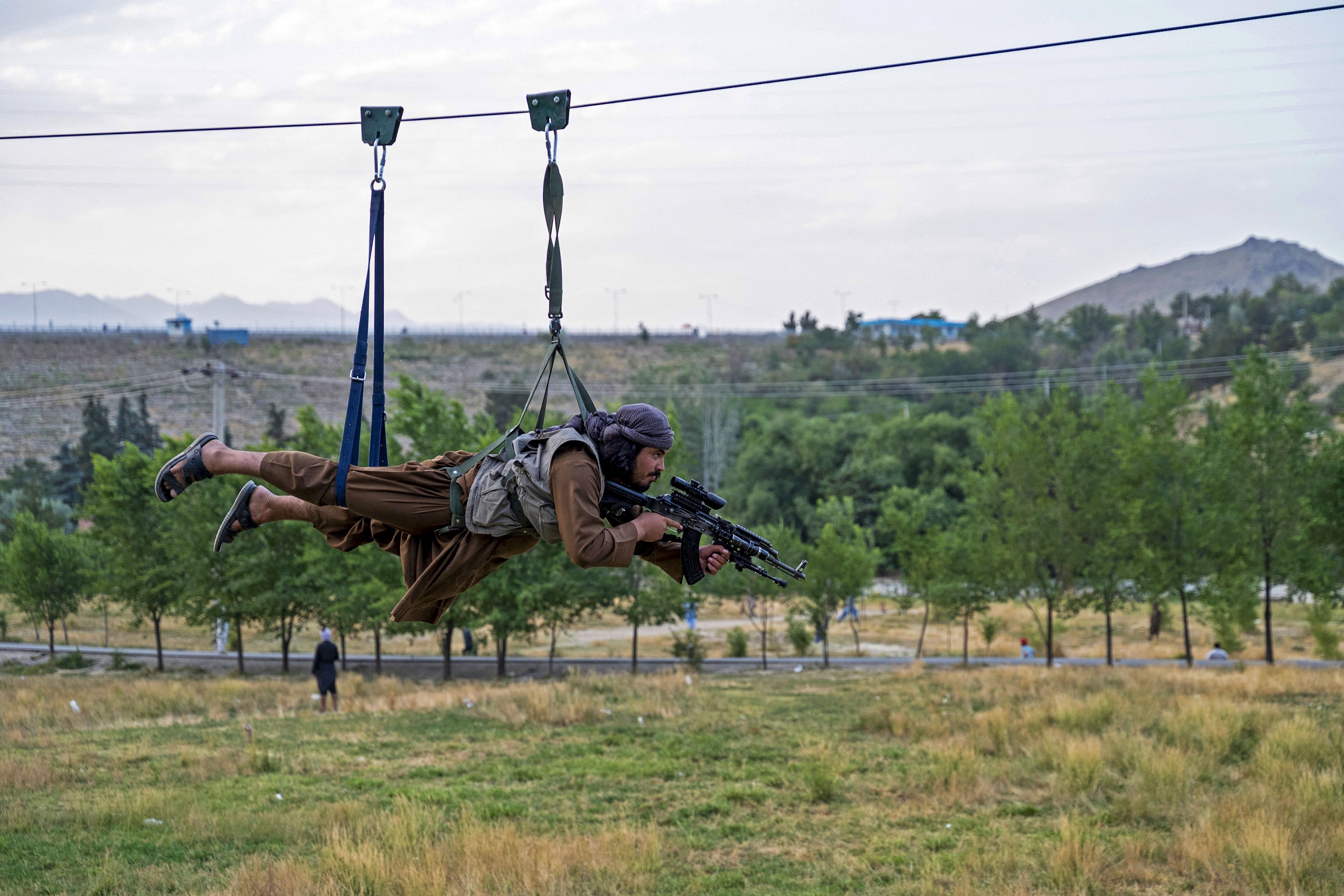 A Taliban security personnel holds his gun as he rides zipline near the Qargha lake on the outskirts of Kabul on July 4, 2024. (Photo by Wakil Kohsar/AFP Photo)