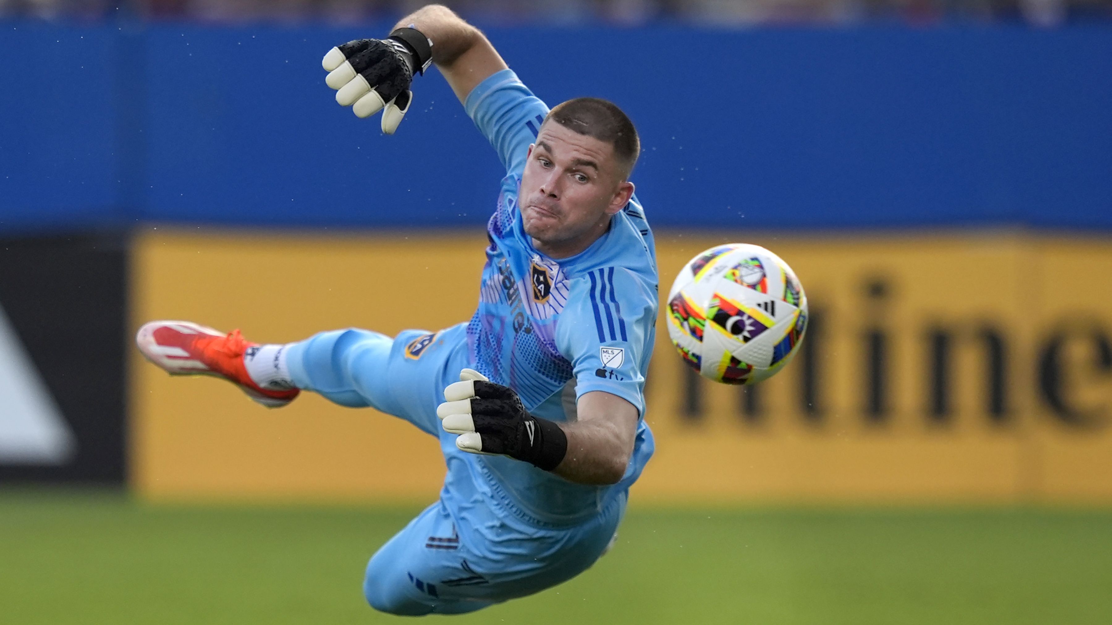 Los Angeles Galaxy goalkeeper John McCarthy watches a shot go wide during the first half of an MLS soccer match against FC Dallas, Saturday, July 13, 2024, in Frisco, Texas. (Photo by LM Otero/AP Photo)