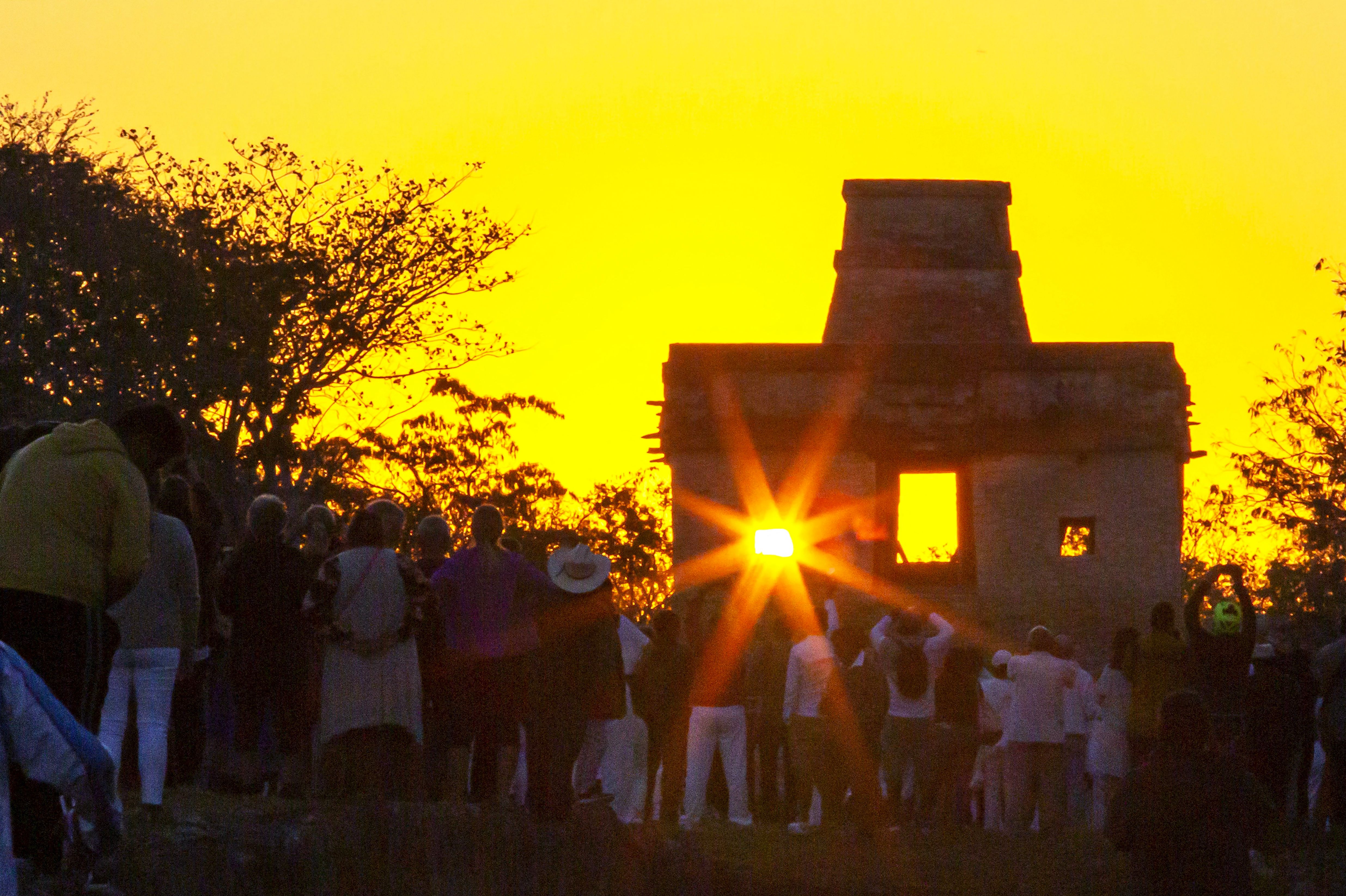 The sun is seen through the door of the Seven Dolls Temple, in the Maya archaeological site of Dzibilchaltun in Yucatan State, Mexico, during the celebration of the spring equinox on March 21, 2023. (Photo by Hugo Borges/AFP Photo)