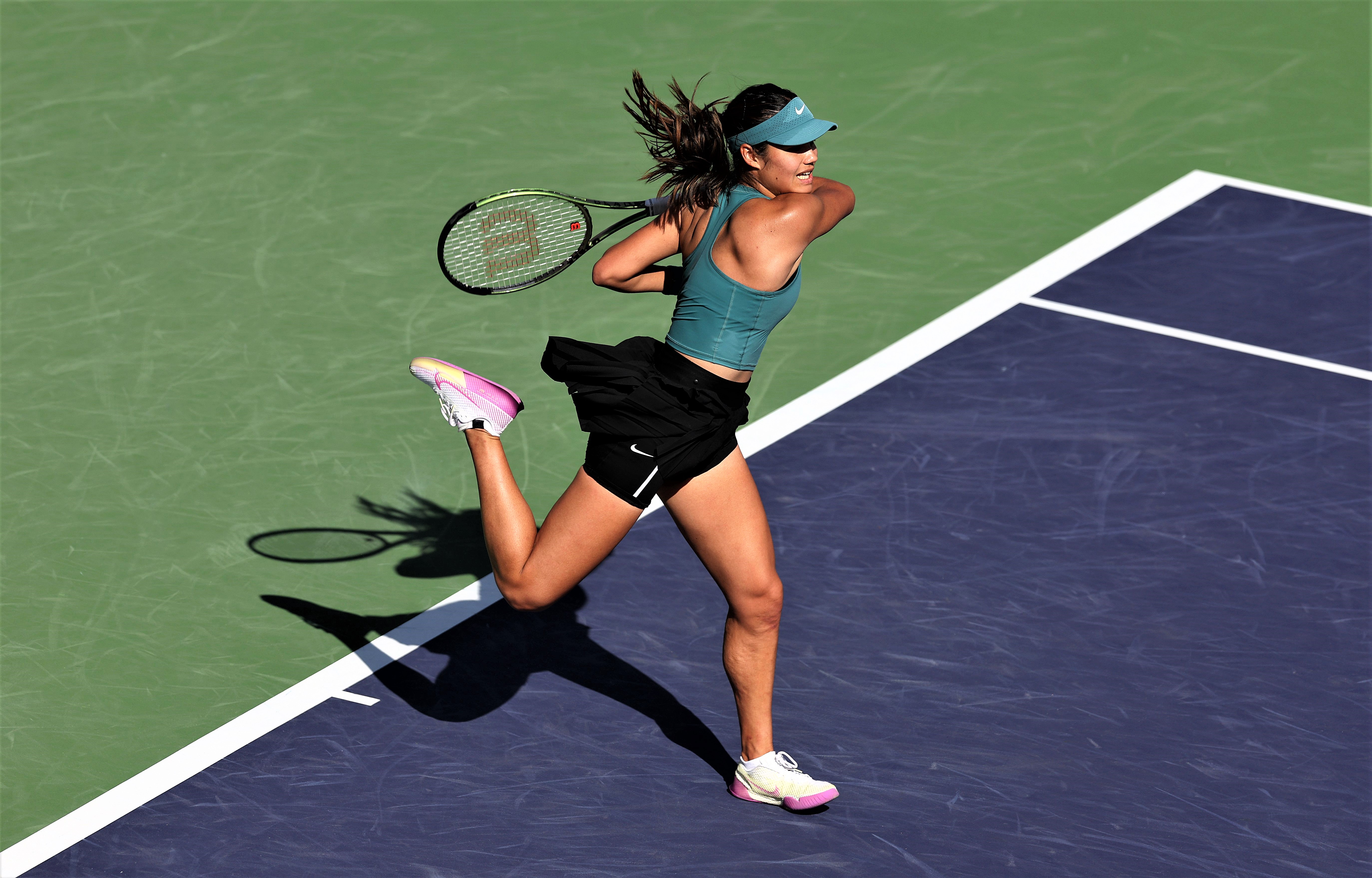 Emma Raducanu of Great Britain in action against Beatriz Haddad Maia of Brazil during the BNP Paribas Open on March 13, 2023 in Indian Wells, California. (Photo by Julian Finney/Getty Images)