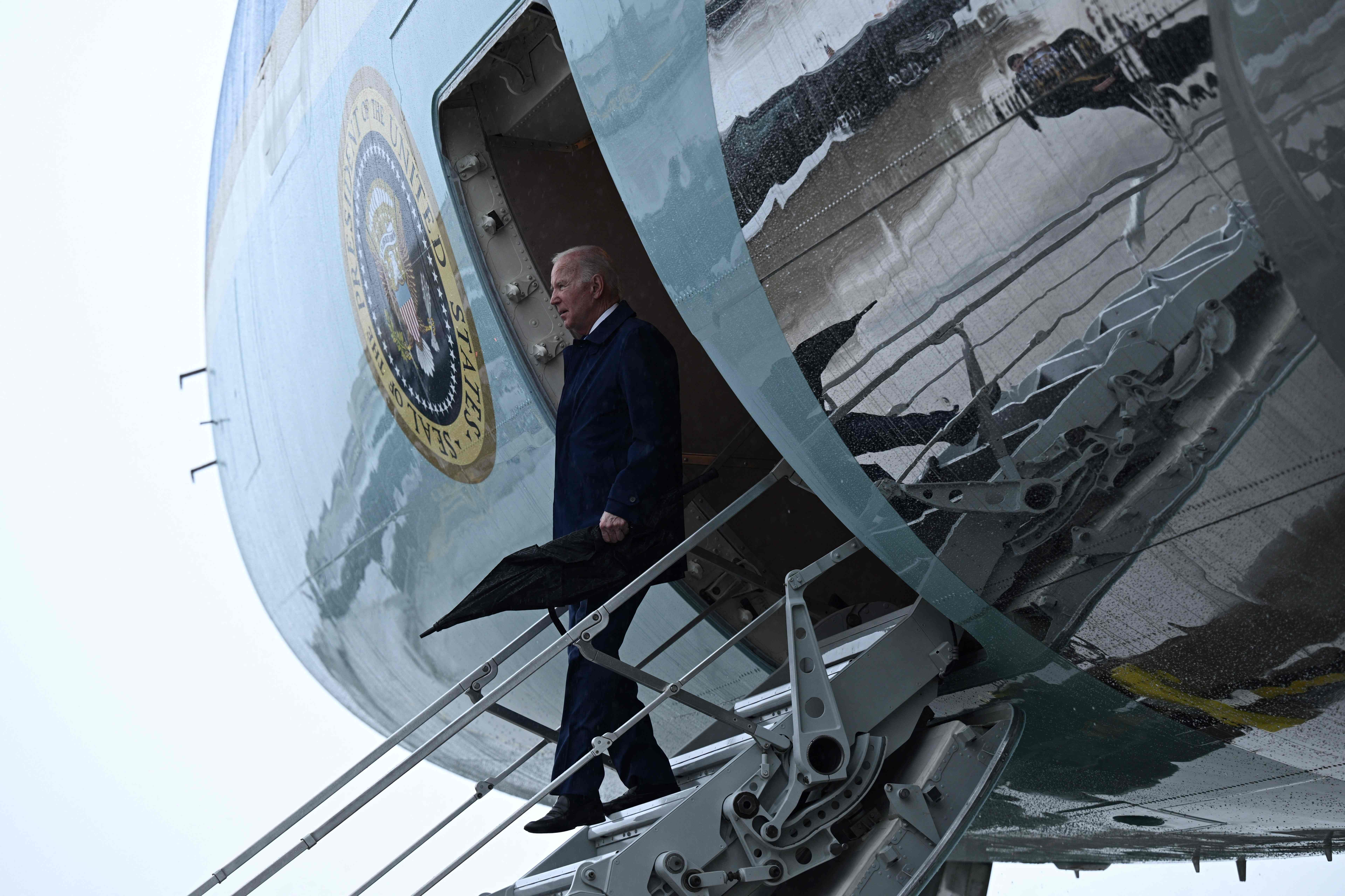 US President Joe Biden arrives to attend the G7 Summit at the US Marine Corps base in Iwakuni on May 18, 2023. (Photo by Brendan Smialowski/AFP Photo)