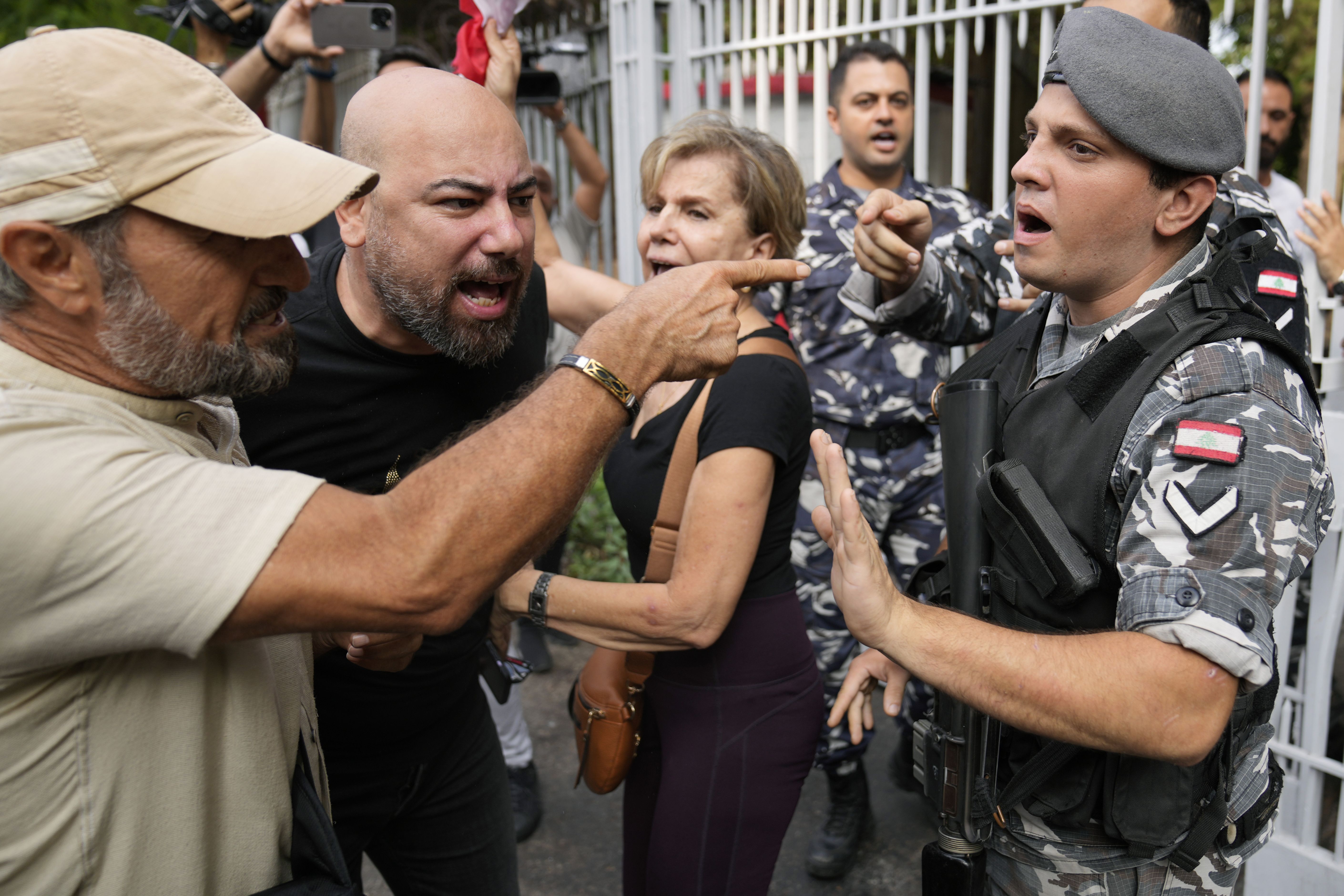 A Lebanese police officer blocks protesters from entering the court building, as they protest against Riad Salameh, the former governor of Lebanon's Central Bank, in Beirut, Lebanon, Monday, September 9, 2024. (Photo by Hussein Malla/AP Photo)