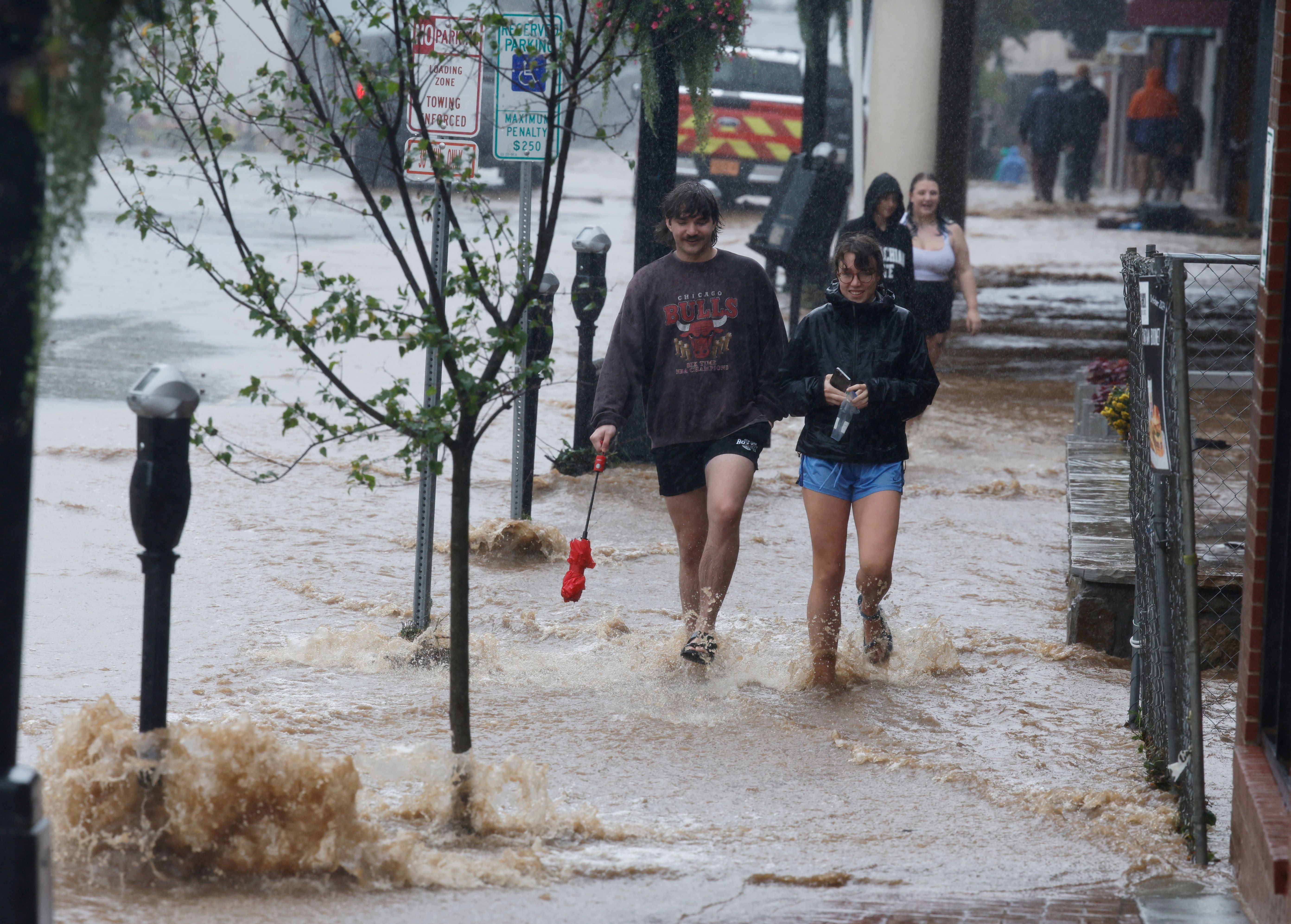 University students walk through flowing flood waters in the town’s main King Street thoroughfare as Tropical Storm Helene strikes, in Boone, North Carolina on September 27, 2024. (Photo by Jonathan Drake/Reuters)
