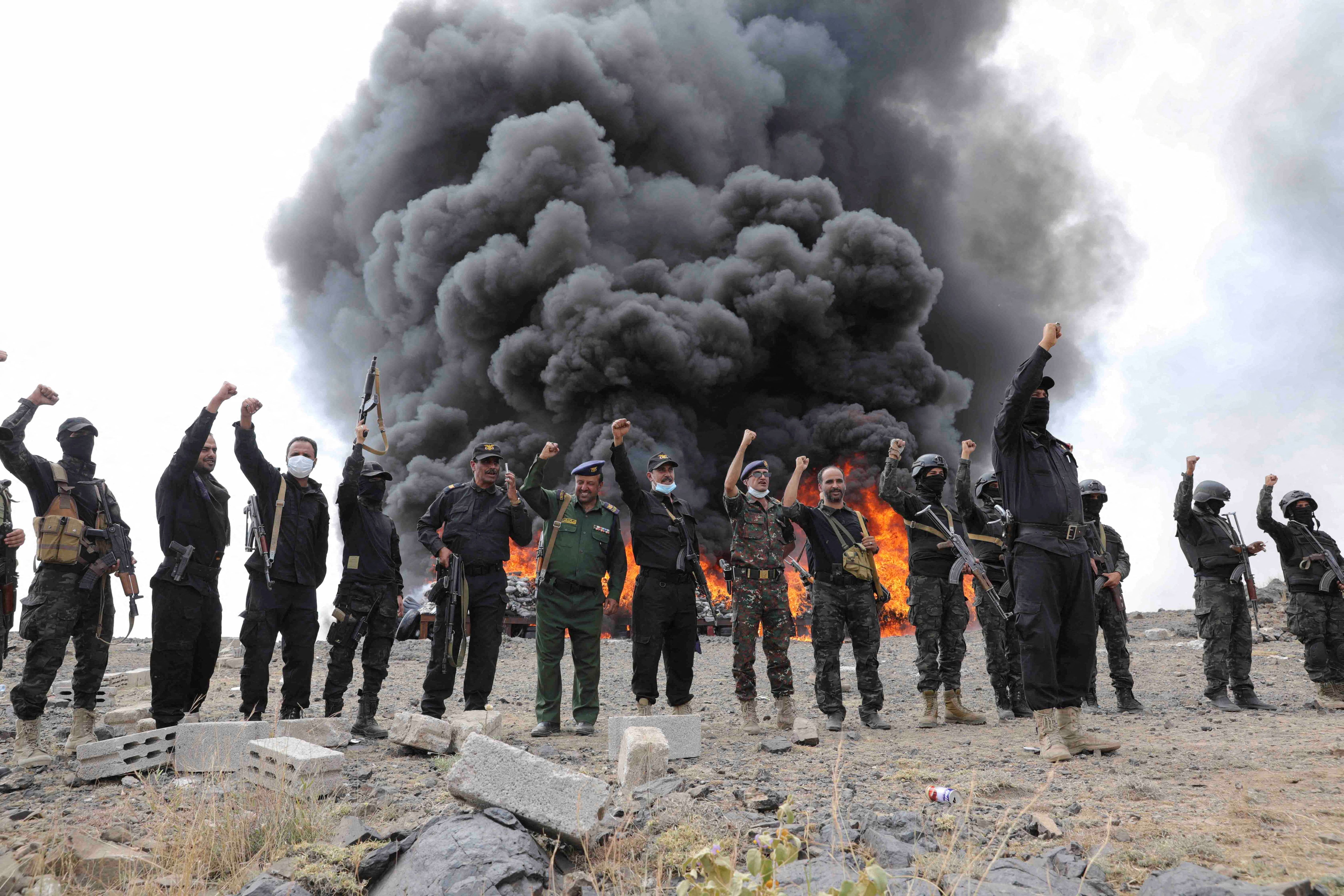 Members of Houthi security forces chant slogans near a fire, as Houthi de facto authorities burn seized narcotics, in Sanaa, Yemen on July 20, 2024. (Photo by Khaled Abdullah/Reuters)