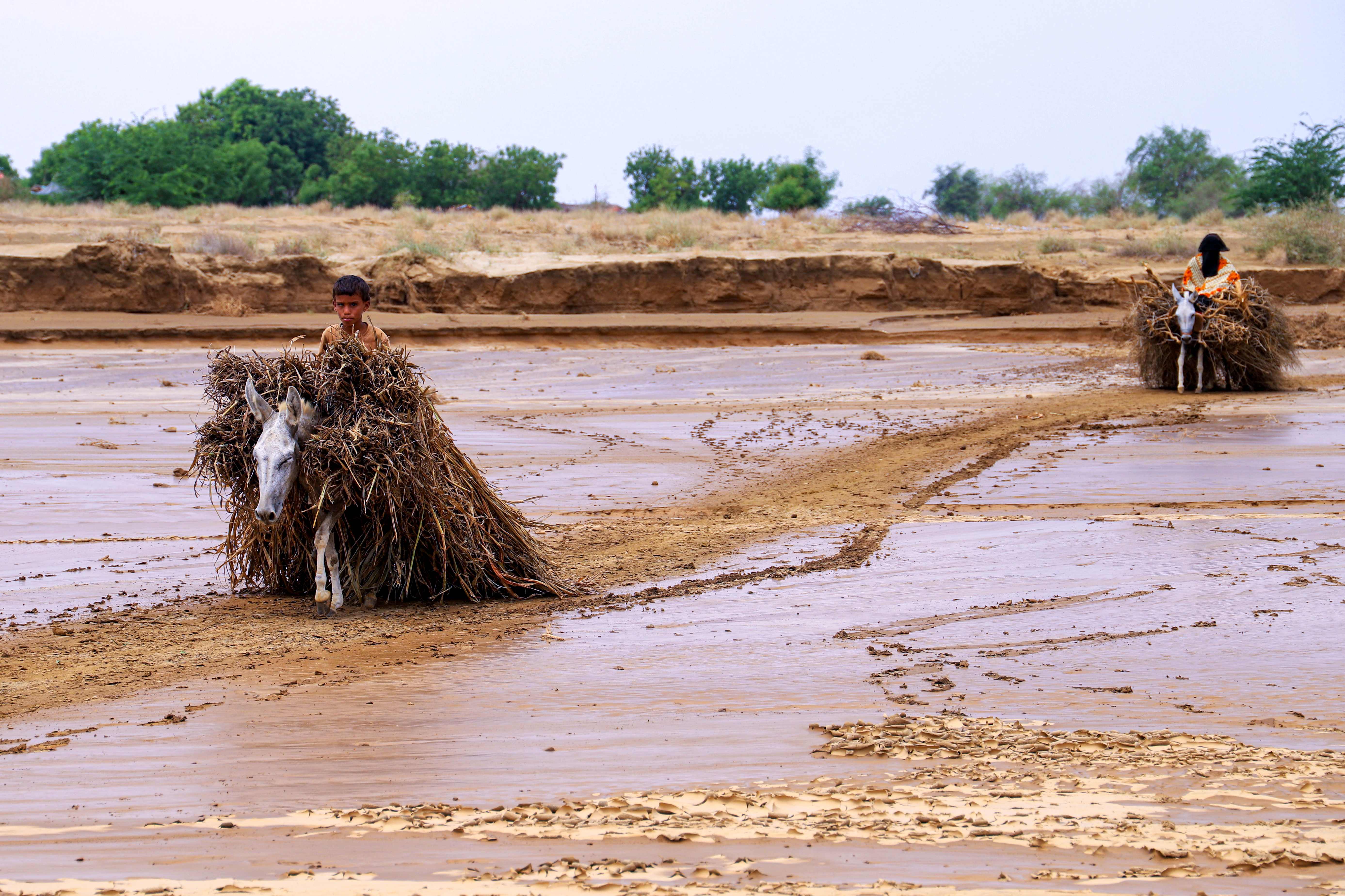 A boy and a woman ride donkeys loaded with kindling across a muddy road following floods in Yemen's Hodeida region, on August 8, 2024. Flooding triggered by torrential rain has left 45 people dead in Yemen in recent days, according to tolls given by a United Nations agency and a local official. Several areas across Yemen have seen heavy rainfall and flooding since late July, affecting daily life for many people in the war-ravaged country. (Photo by AFP Photo/Stringer)