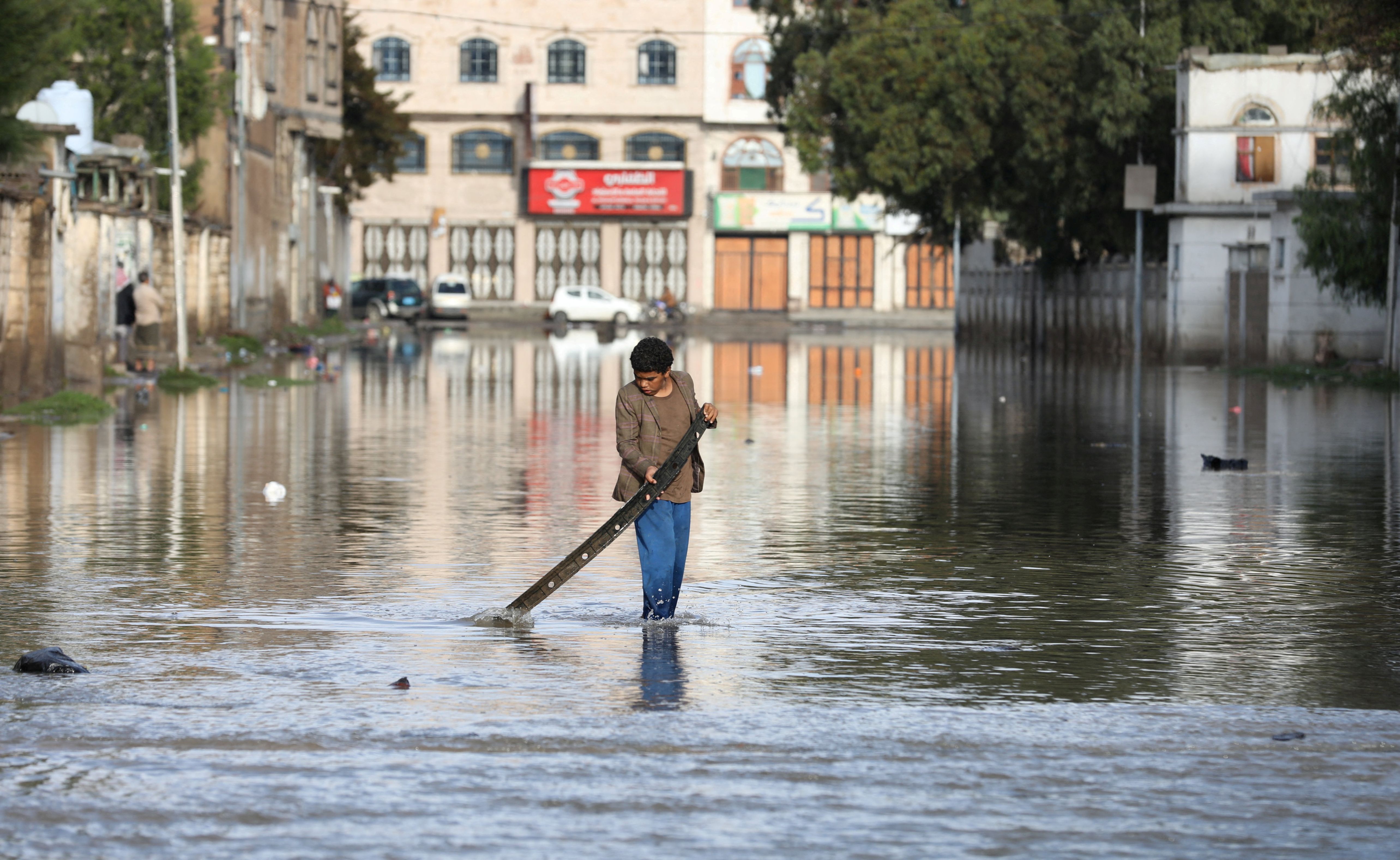 A boy plays on a flooded street following rains in Sanaa, Yemen on August 15, 2024. (Photo by Khaled Abdullah/Reuters)