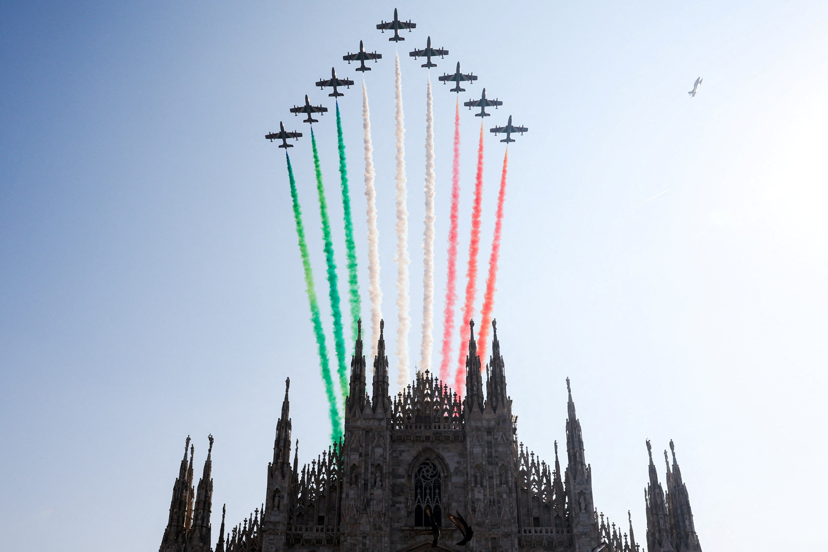 The Duomo Cathedral is seen as the aerobatic demonstration team of the Italian Air Force the “Frecce Tricolori” (Tricolor Arrows) performs to mark the 100th anniversary of the foundation of the Italian military's air forces in Milan, Italy on September 11, 2023. (Photo by Claudia Greco/Reuters)