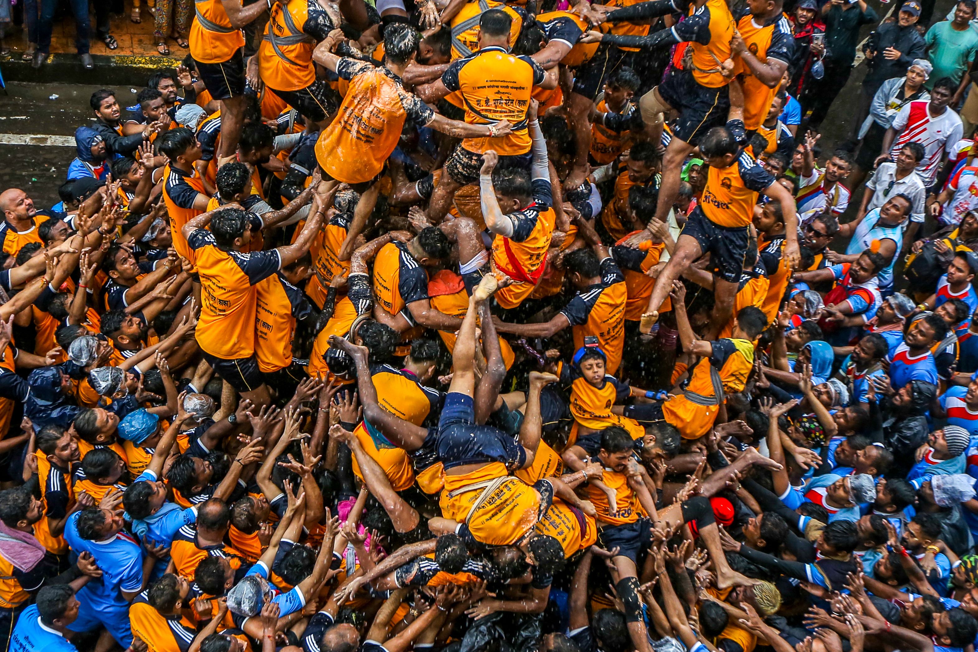 Indian devotees fall after forming a human pyramid to reach and break a “dahi-handi” (curd-pot), on the occasion of the Janmashtami Festival in Mumbai, India, 07 September 2023. Hindu devotees take part in the celebration in which an earthen pot is suspended high above the ground and young men and children form a human pyramid to reach the pot and break it. The festival celebrates the birth of the Hindu god Lord Krishna, one of the most popular gods in Hinduism. (Photo by Divyakant Solanki/EPA/EFE/Rex Features/Shutterstock)