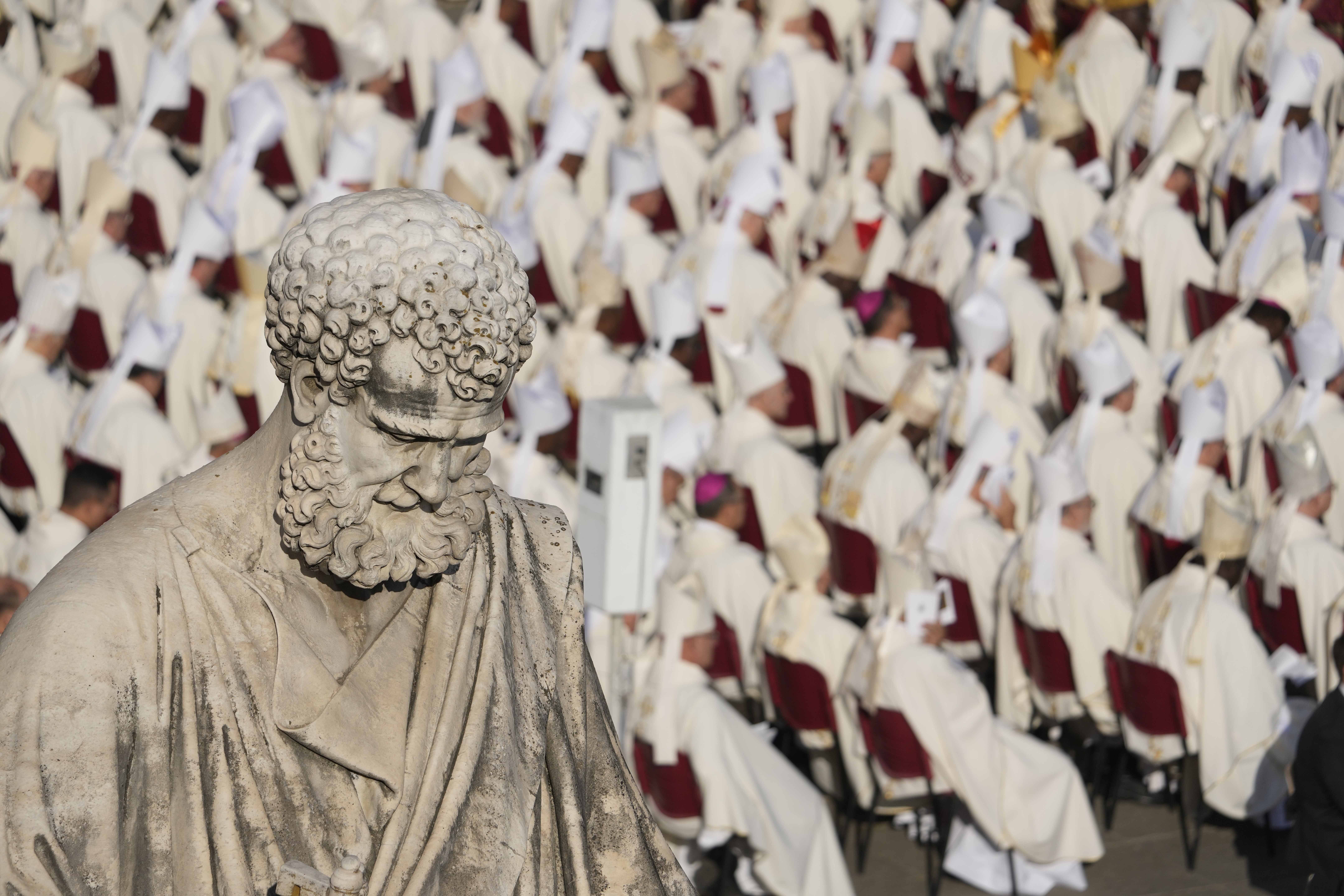Prelates attend a mass presided over by Pope Francis and concelebrated by the new cardinals for the start of the XVI General Assembly of the Synod of Bishops in St. Peter's Square at The Vatican, Wednesday, October 4, 2023. Pope Francis is convening a global gathering of bishops and laypeople to discuss the future of the Catholic Church, including some hot-button issues that have previously been considered off the table for discussion. Key agenda items include women's role in the church, welcoming LGBTQ+ Catholics, and how bishops exercise authority. For the first time, women and laypeople can vote on specific proposals alongside bishops (Photo by Andrew Medichini/AP Photo)