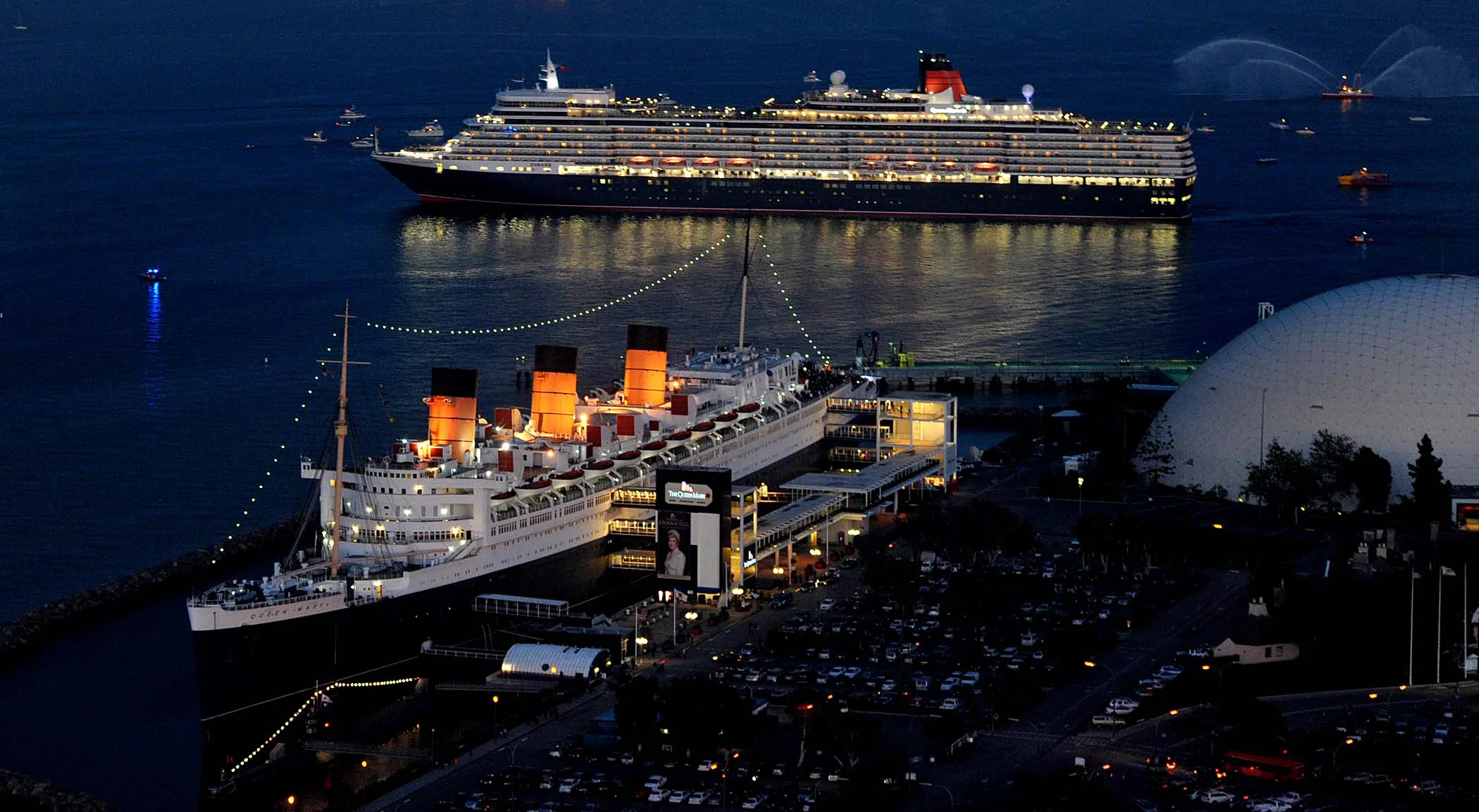 Cunard's ocean liner Queen Elizabeth meets her docked sister ship Queen Mary in Long Beach, California, on March 12, 2013. This is the Queen Mary�s first encounter with a Queen Elizabeth since 1967 when the Queen Mary, during her final transatlantic crossing, passed by the original Queen Elizabeth. (Photo by John Shearer/Invision for Cunard)