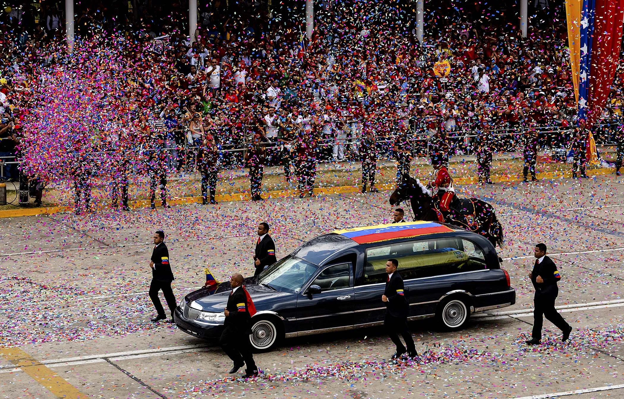A funeral procession escorts the remains of Hugo Chavez, who died March 5, in Caracas, Venezuela, on March 15, 2013. Chavez's body was taken to its final resting place at the 4F military museum on the outskirts of the 23 de Enero neighborhood. (Photo by Meridith Kohut/The New York Times)