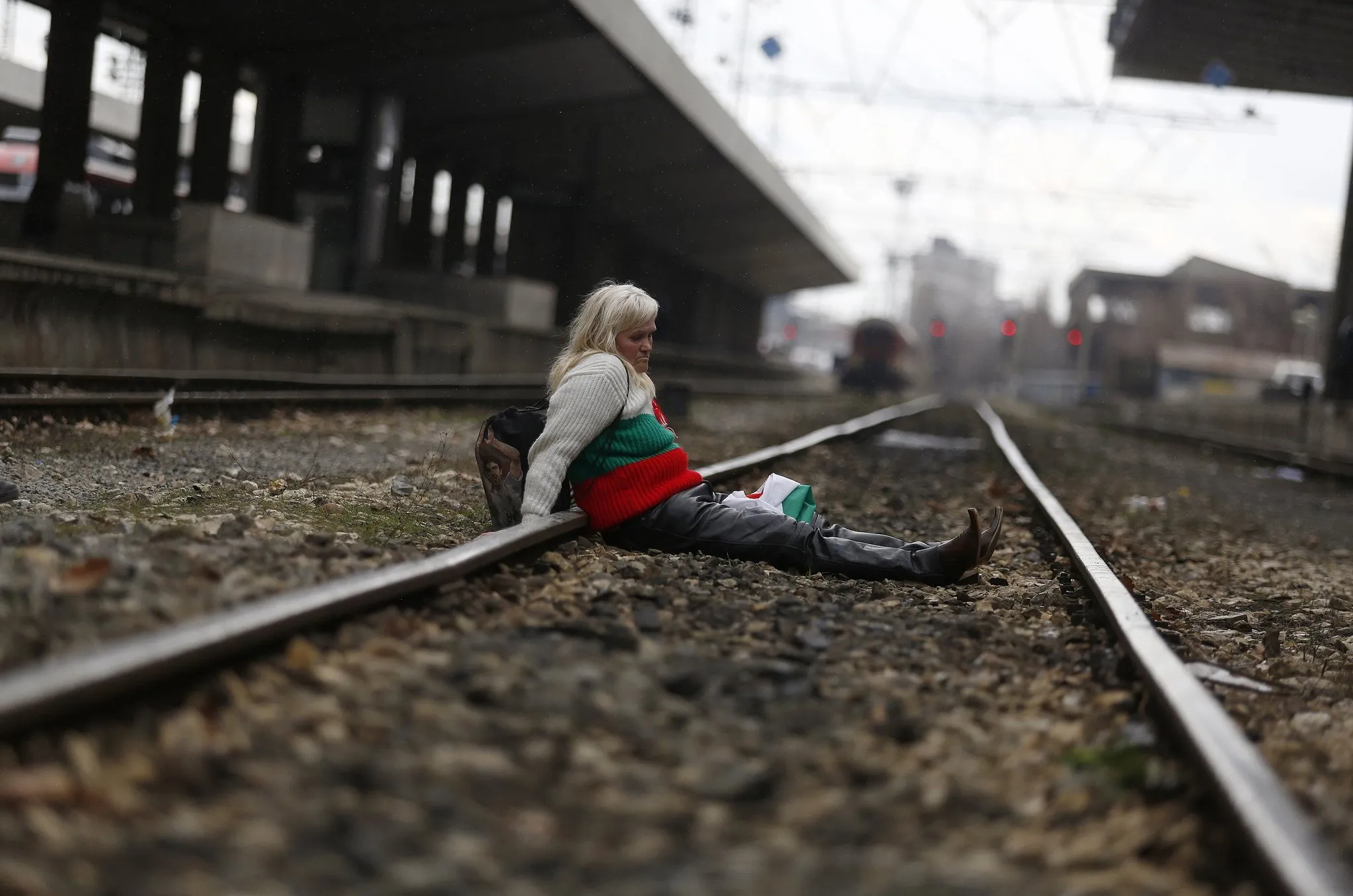 A protester, wearing a sweater in the colours of the Bulgarian national flag, sits on the tracks as demonstrators block the main railway station in Sofia March 10, 2013. Hundreds of Bulgarians took to the streets for a fourth Sunday in a row against monopolies and widespread corruption, demanding a stop to the planned sale of the cargo unit of ailing state railway operator BDZ and an audit of all privatisation deals. (Photo by Stoyan Nenov/Reuters)