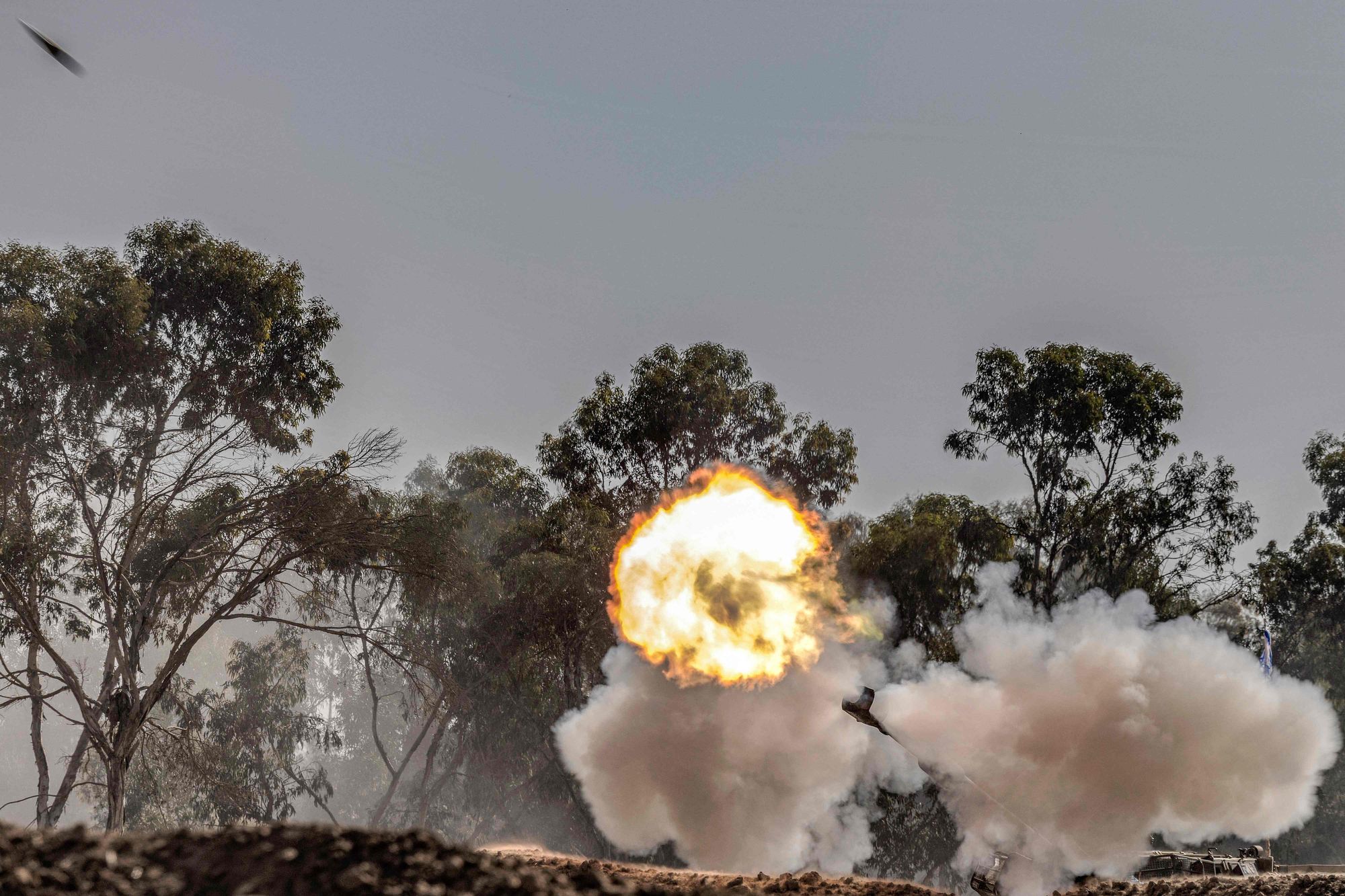 An Israeli army self-propelled artillery howitzer fires rounds from a position near the border with the Gaza Strip in southern Israel on November 6, 2023 amid the ongoing battles between Israel and the Palestinian group Hamas in the Gaza Strip. (Photo by Menahem Kahana/AFP Photo)