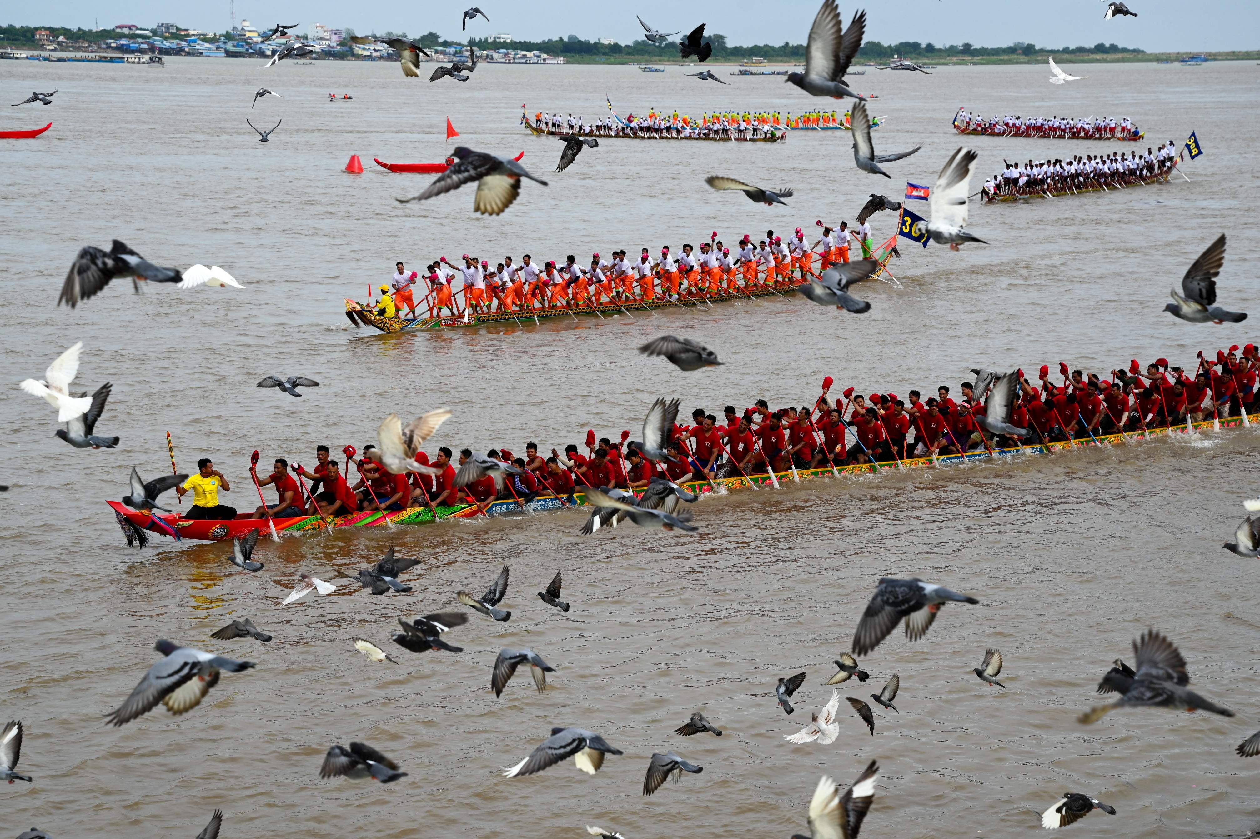Pigeons fly past as participants row dragon boats during a competition as part of the Water Festival on the Tonle Sap river in Phnom Penh on November 26, 2023. (Photo by Tang Chhin Sothy/AFP Photo)