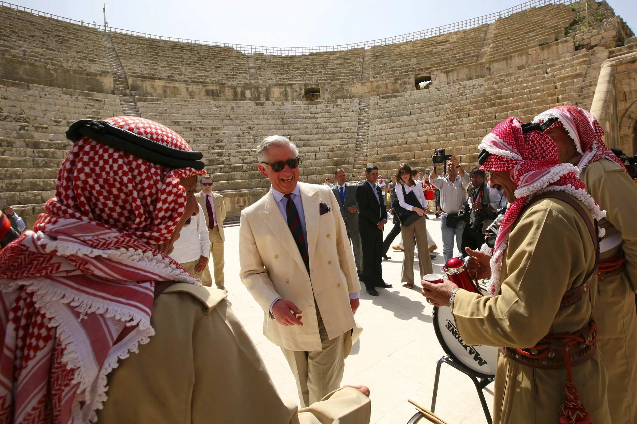 Britain's Prince Charles (C) smiles next to members of a traditional Jordanian troupe as they welcome him during his visit to the ancient Roman ruins in Jerash near Amman March 13, 2013. (Photo by Muhammad Hamed/Reuters)