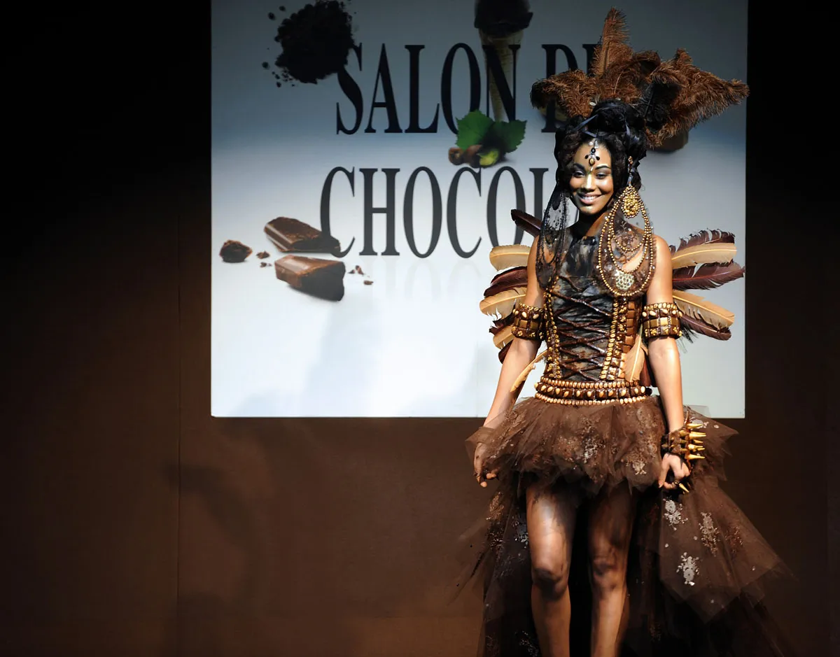 A model presents a dress made from chocolate during the second Bordeaux's Chocolate fair (Salon du Chocolat) on March 15, 2013, in Bordeaux, western France. (Photo by Jean-Pierre Muller/AFP Photo)