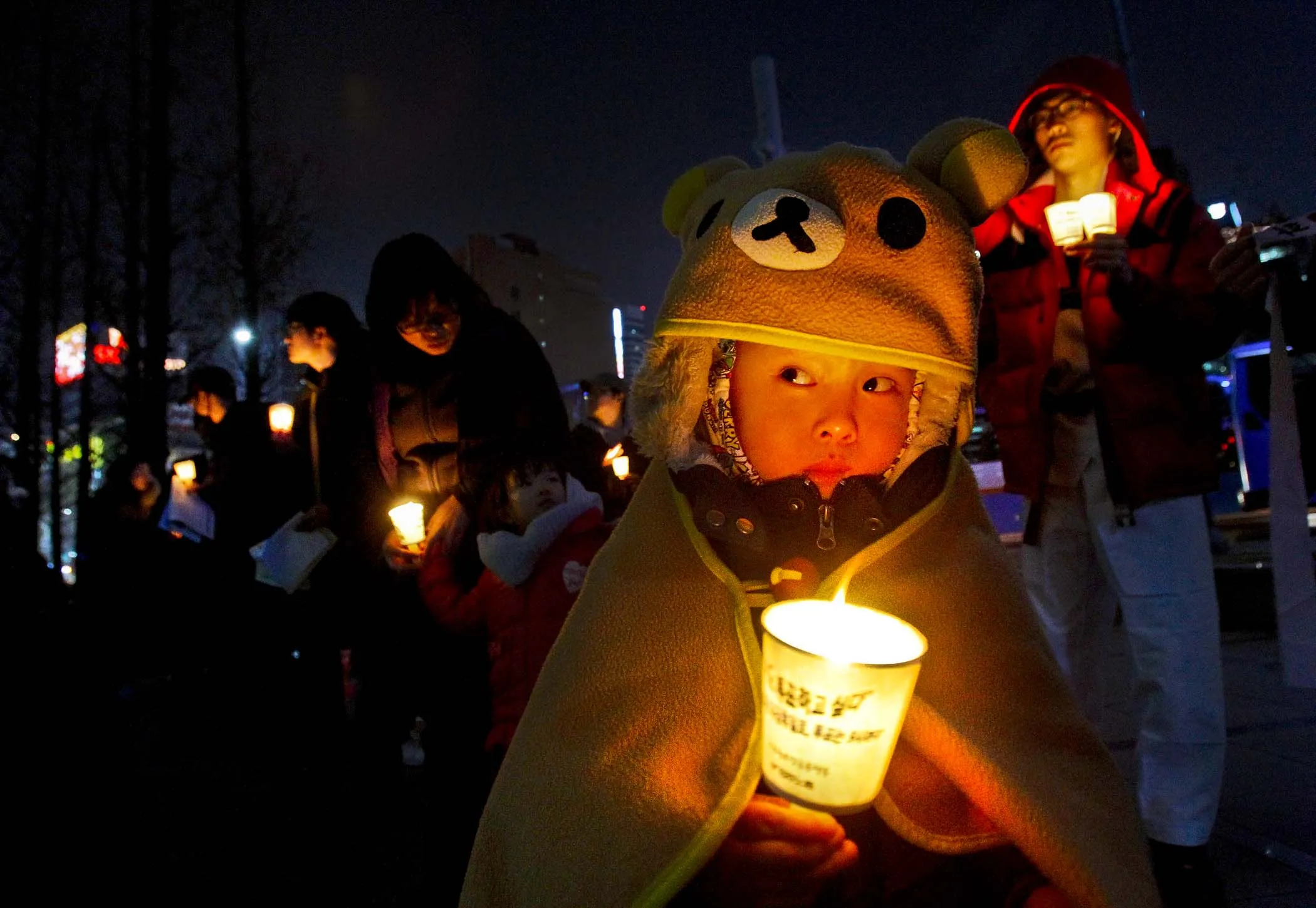 A child holds a candle during a rally denouncing the annual joint military exercises between South Korea and the United States in Seoul, South Korea, on March 15, 2013. (Photo by Ahn Young-joon/Associated Press)