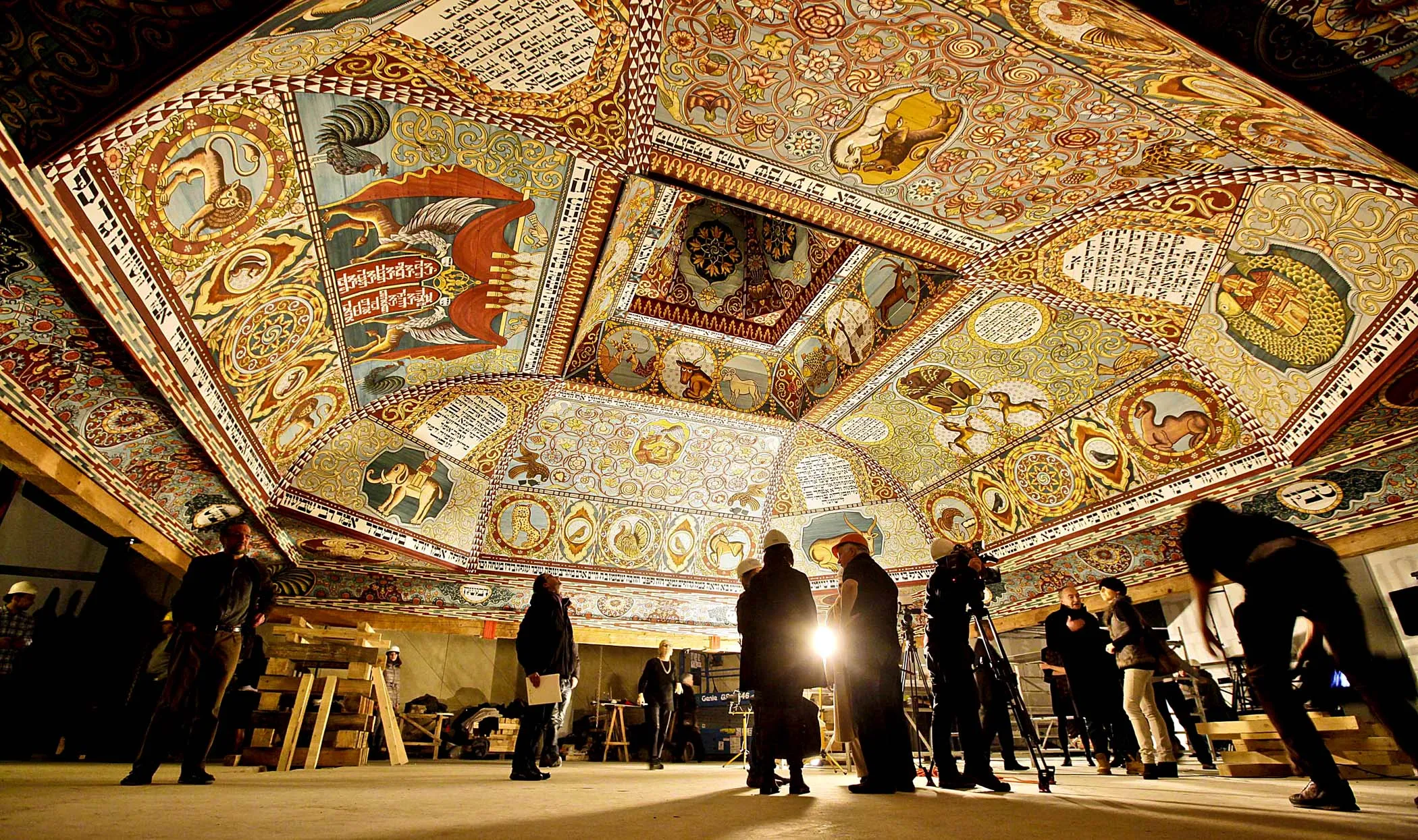 Visitors look at the the painted ceiling of a reconstructed wooden synagogue that dates back centuries during a presentation to the media in Warsaw, Poland, on March 12, 2013. The painting in the17th century synagogue is a key attraction in the Museum of the History of Polish Jews, a major institution due to open next year in Warsaw. (Photo by Czarek Sokolowski/Associated Press)
