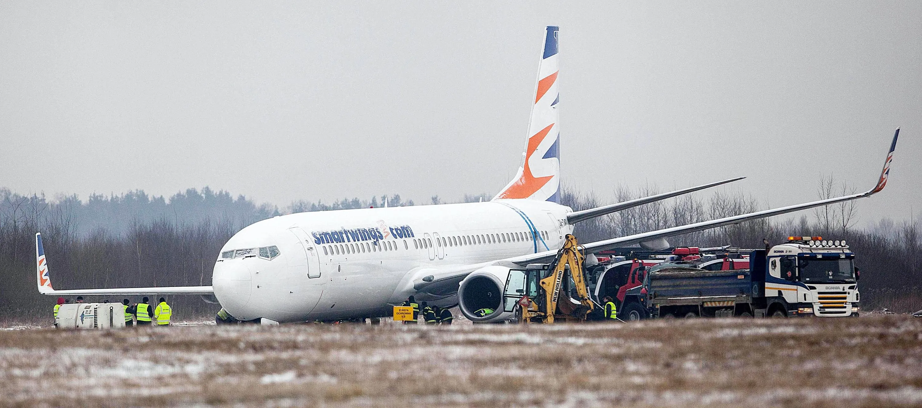 Teams of Czech and Polish experts are working to free a Czech Boeing 737 airplane from a muddy field at the airport in Katowice, Poland on Wednesday, March 13, 2013. The plane from the Czech Travel Service airline skidded late Tuesday and went some 20 meters (22 yards) off the Pyrzowice airport runway and ran into wet ground, where its front landing gear sank. None of the 176 passengers and six crew members was hurt. The airport remains closed and flights are redirected to nearby Krakow. (Photo by Artur Gierwatowski/AP Photo)