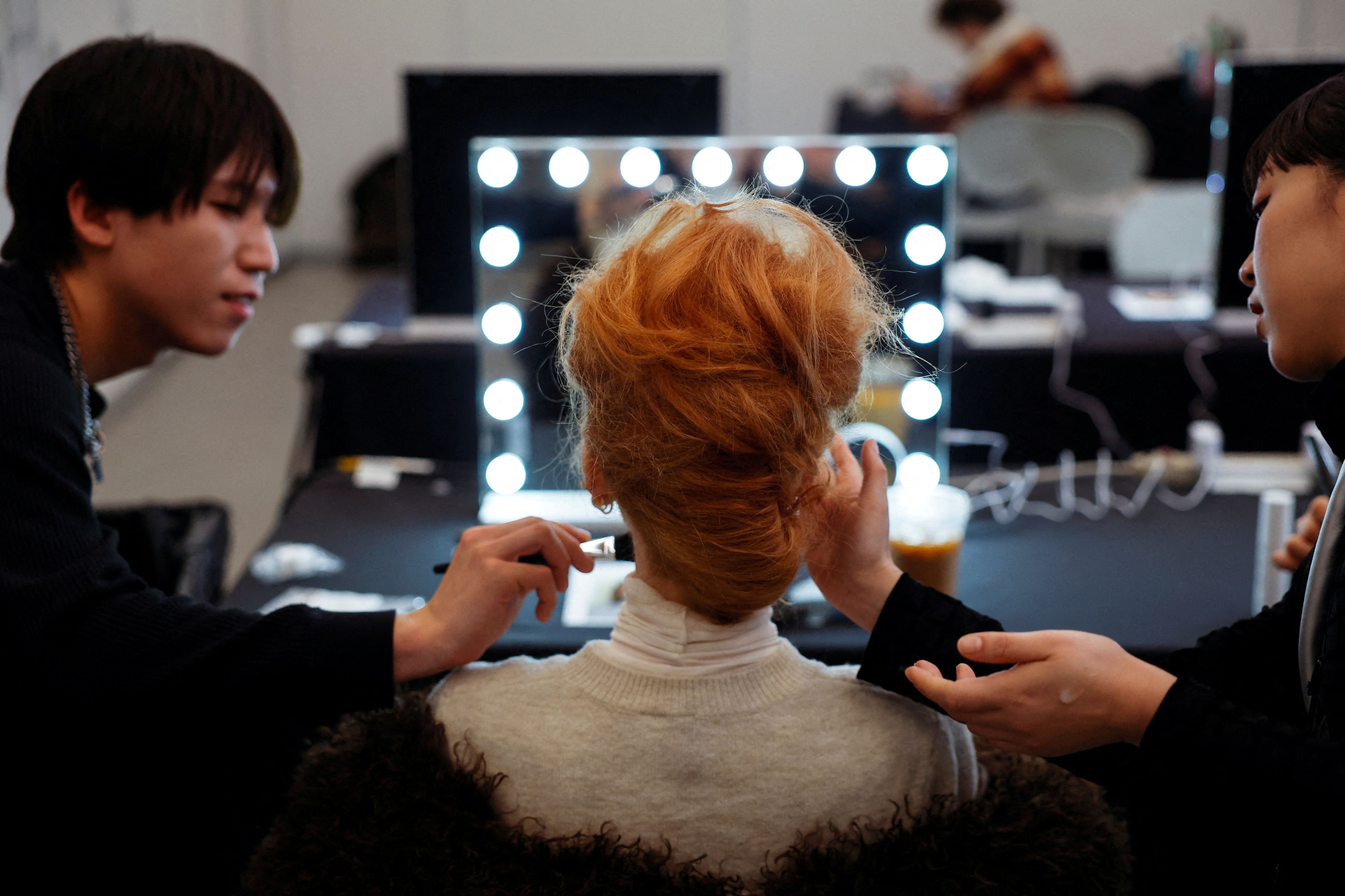 A model prepares backstage before the show for Juzui during New York Fashion Week Fall-Winter 2025 in New York City, U.S., February 7, 2025. (Photo by Shannon Stapleton/Reuters)